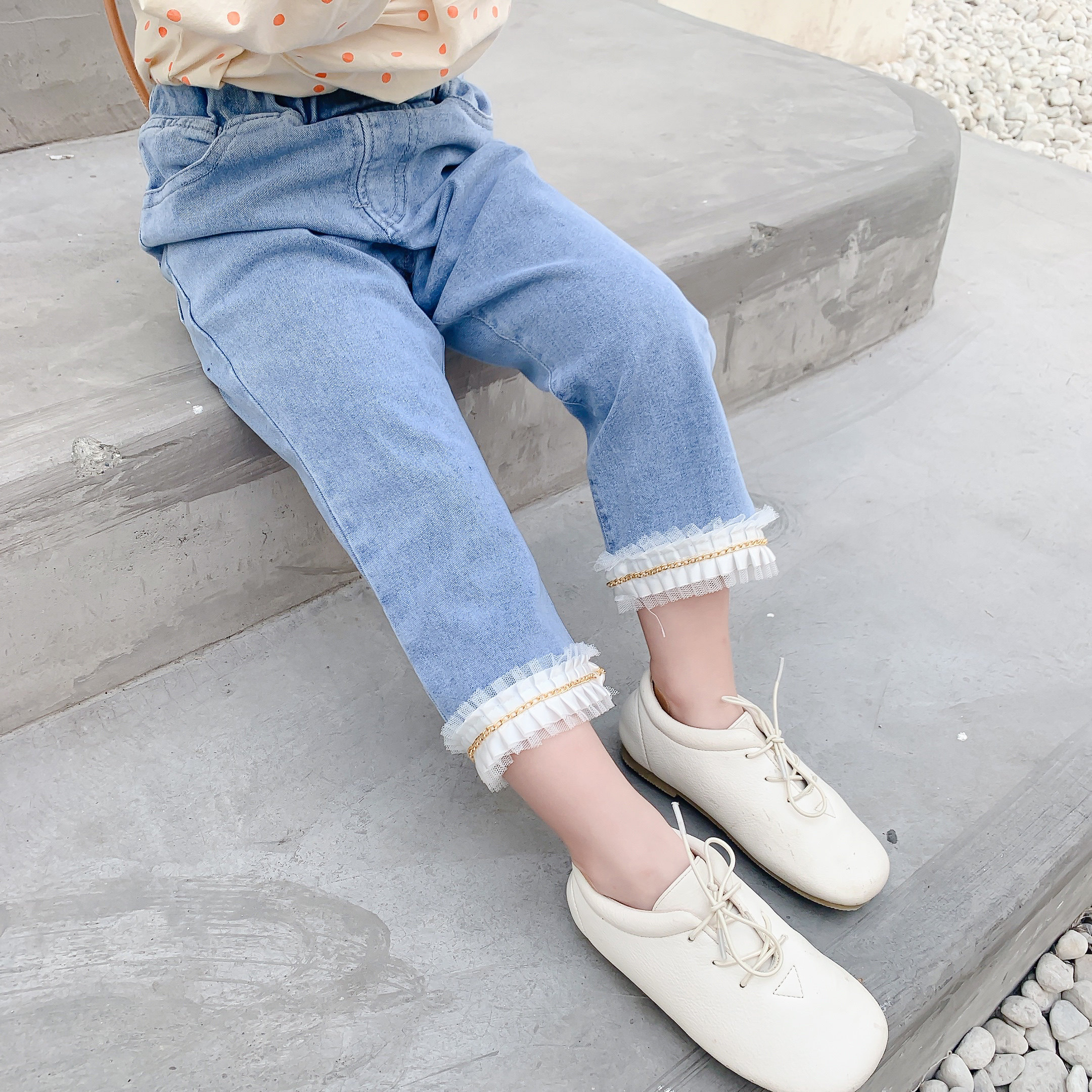 小童码,清仓裤子1-2-3-4-5岁女童花边软牛仔裤女宝宝阔腿裤弹力