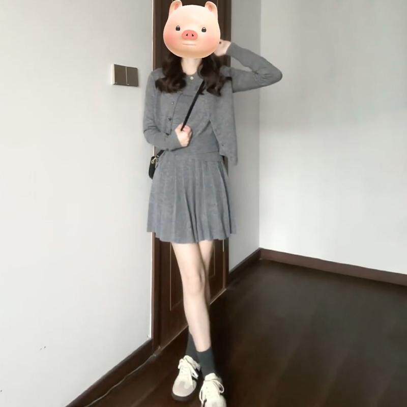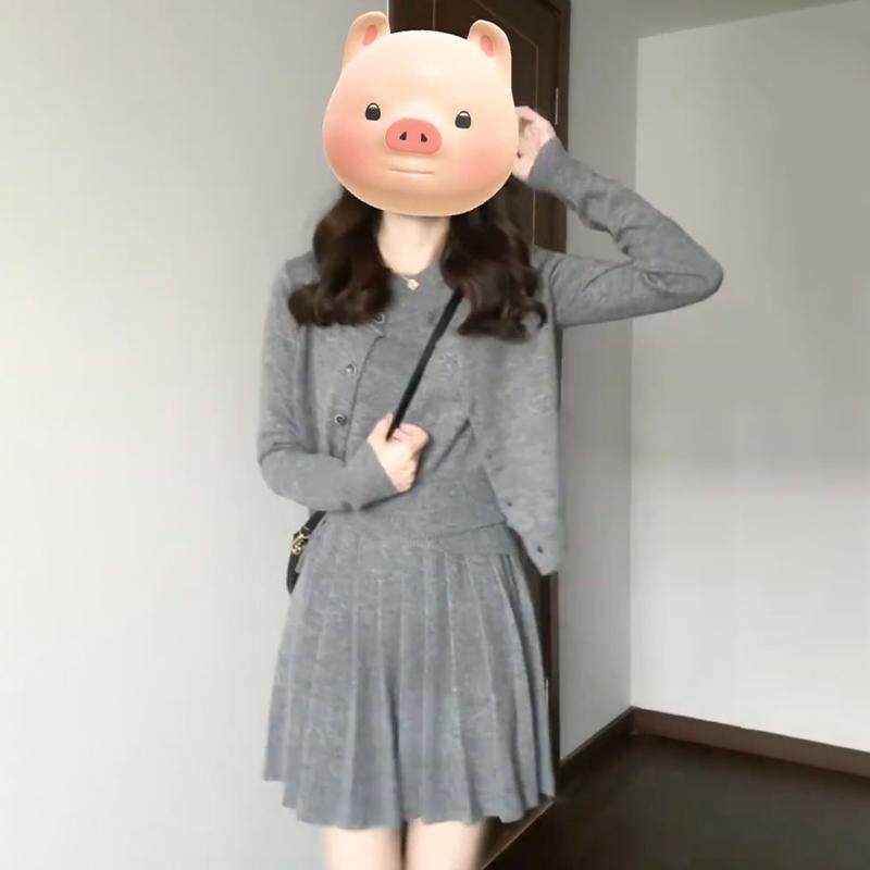 胖妹妹大码2-300斤灰色遮肉百褶裙三件套2026新款早春套装连衣裙