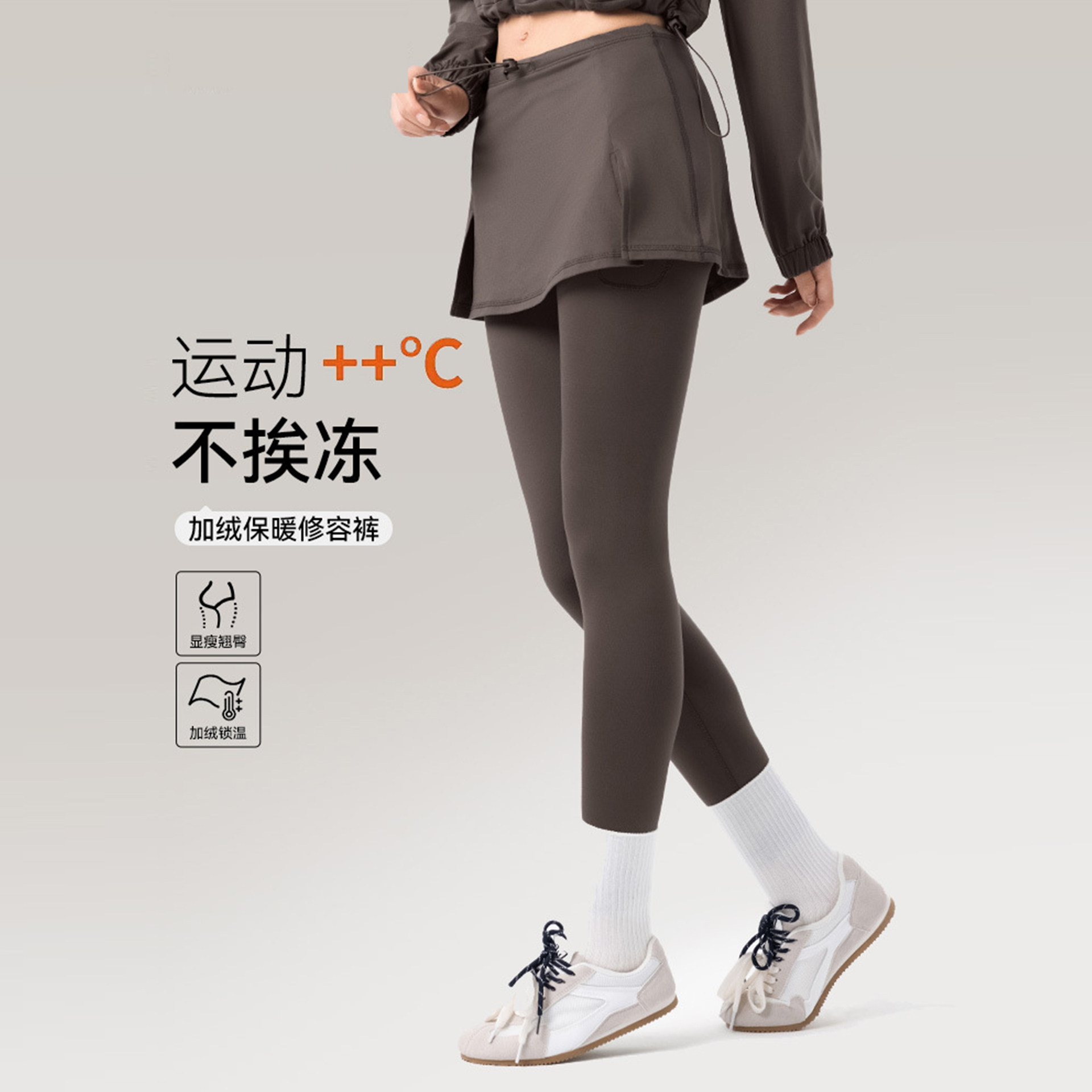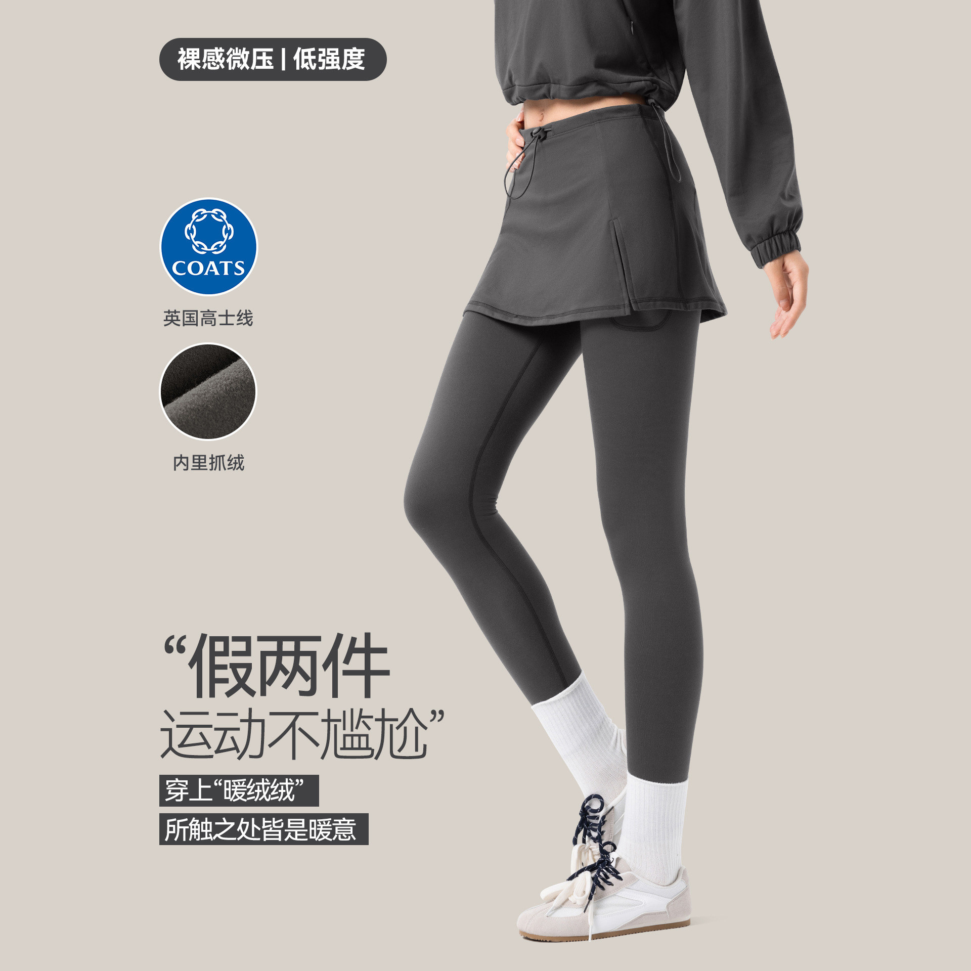 女加绒保暖假两件运动裙裤防走光带口袋普拉提瑜伽裤健身跑步长裤