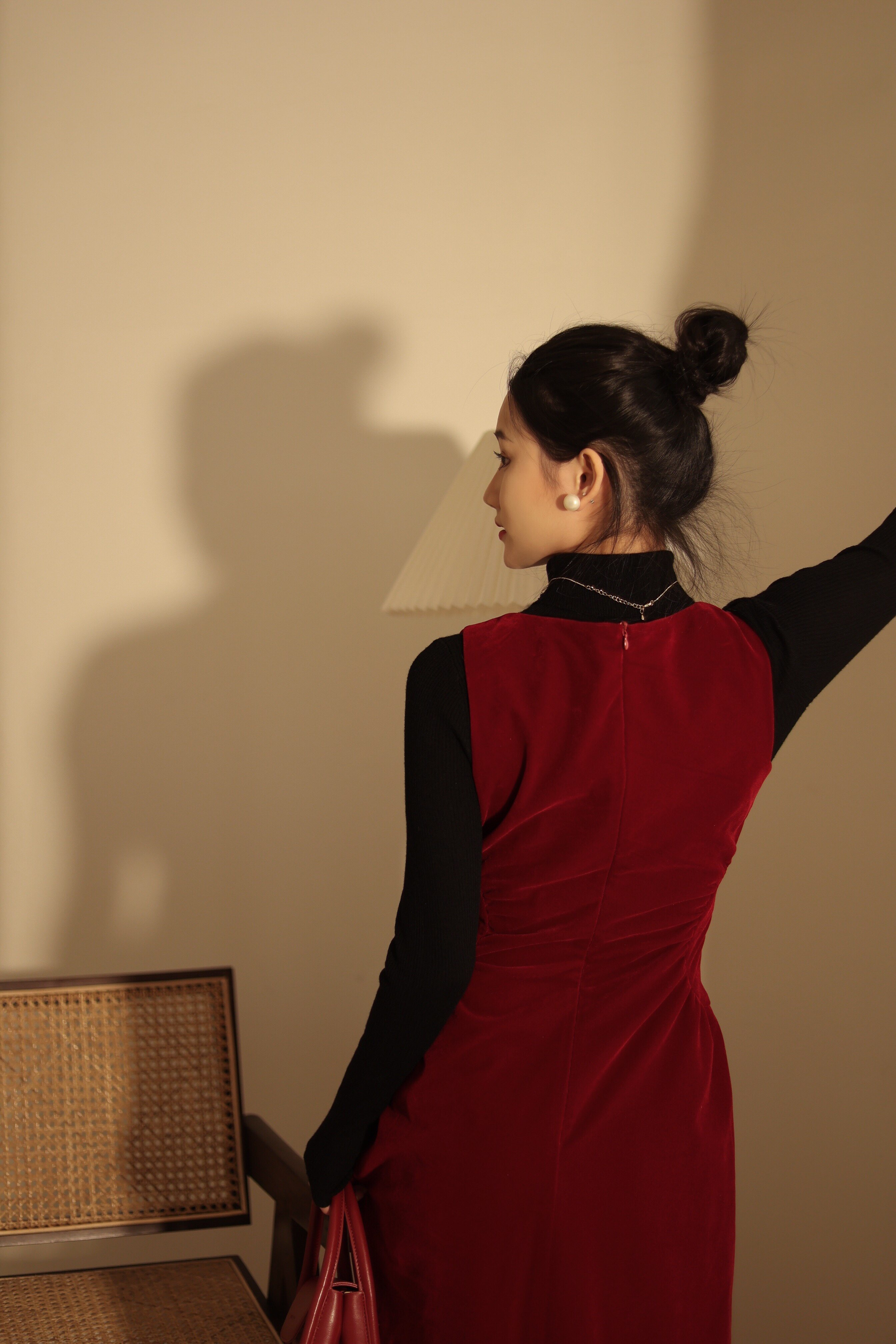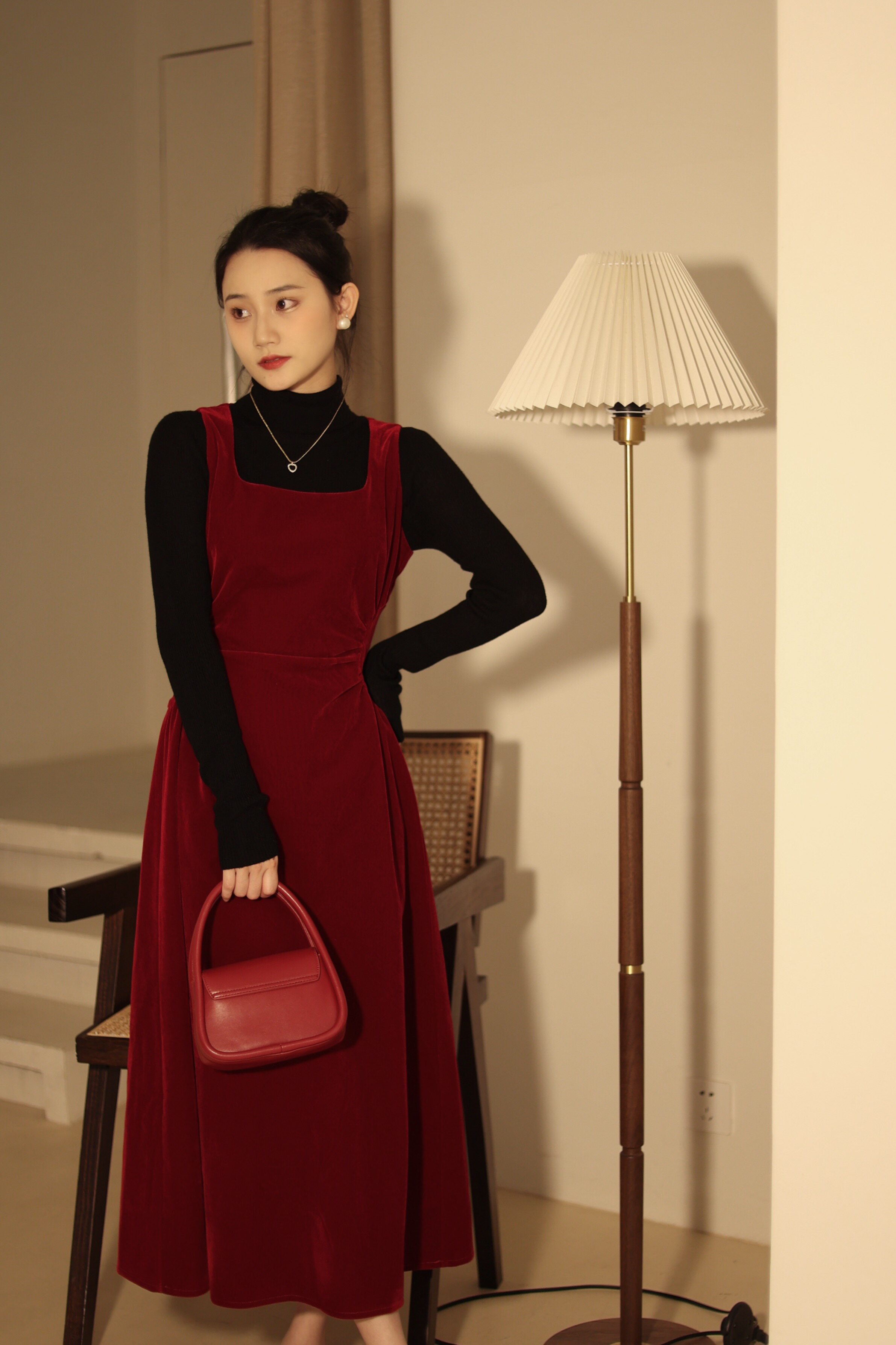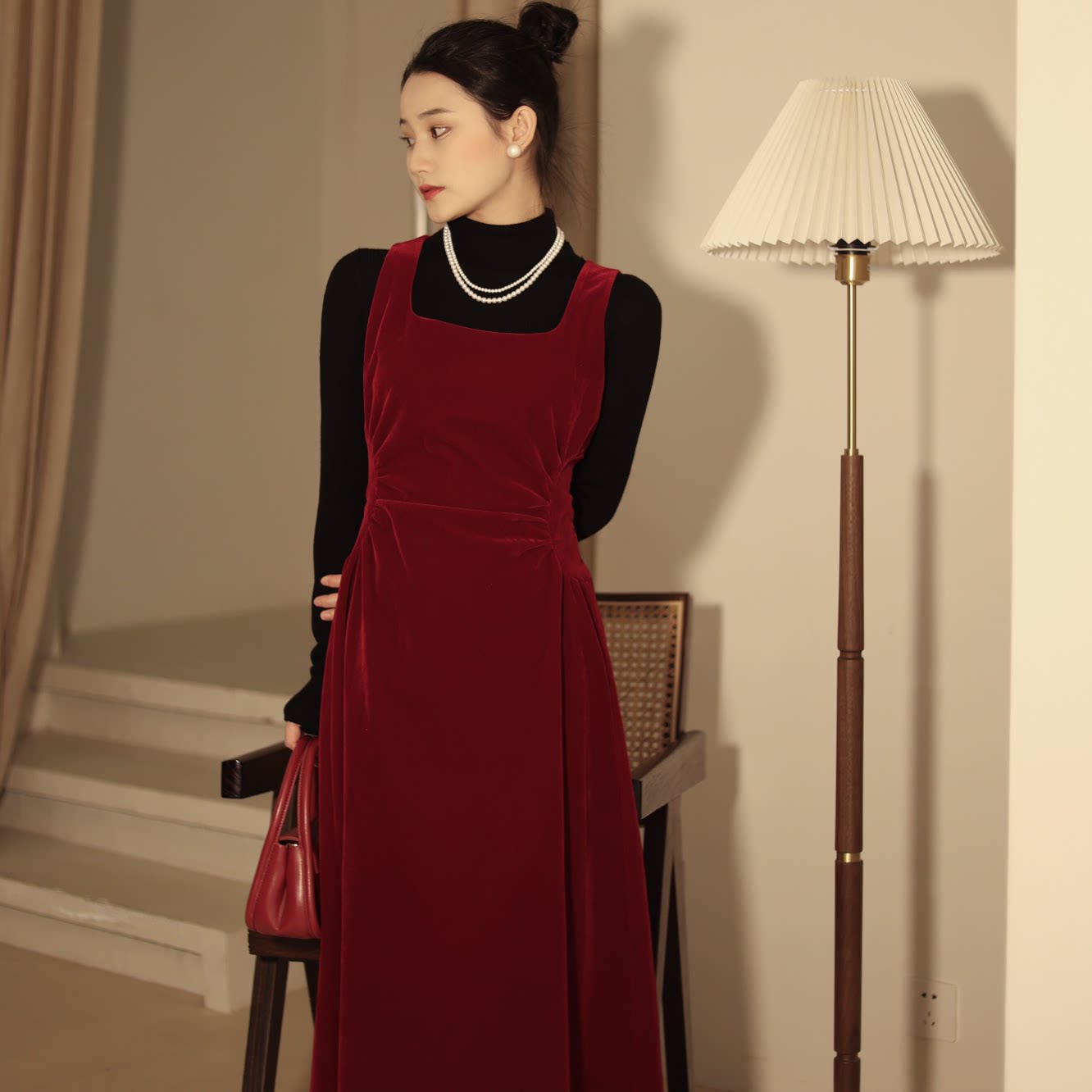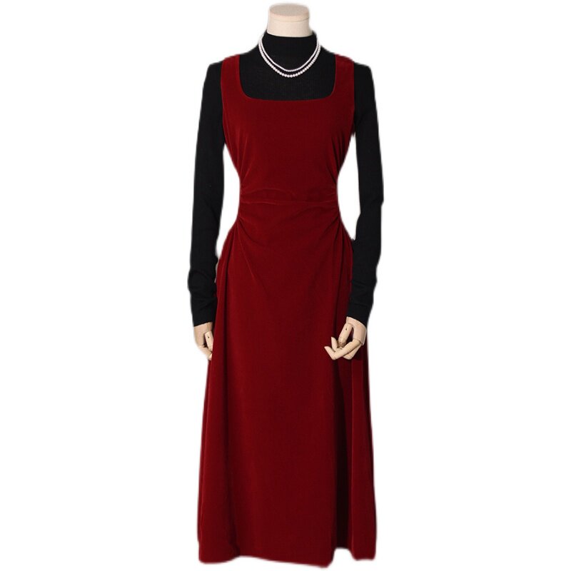 喵吉复古内搭收腰小个子订婚裙过年红色丝绒背心连衣裙长裙女春秋