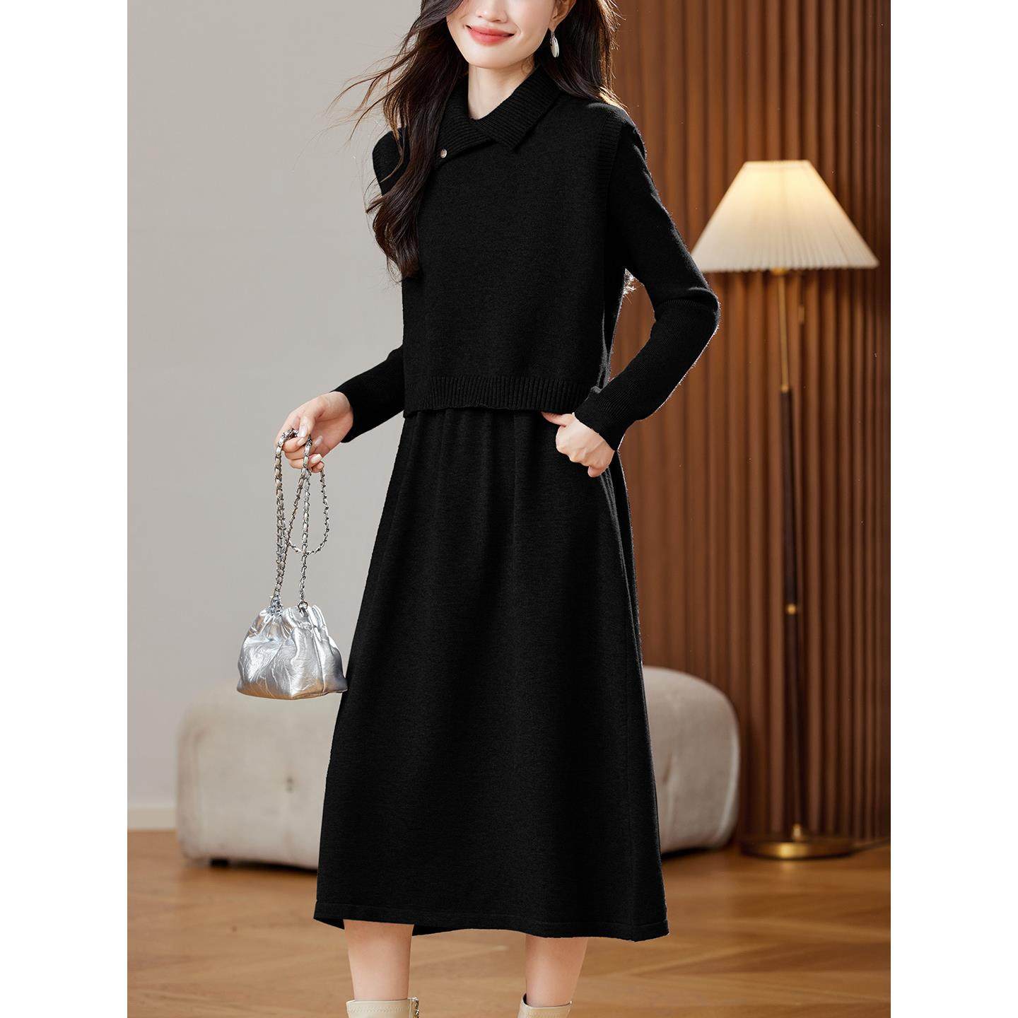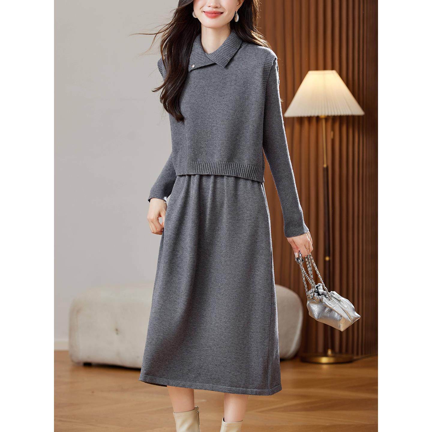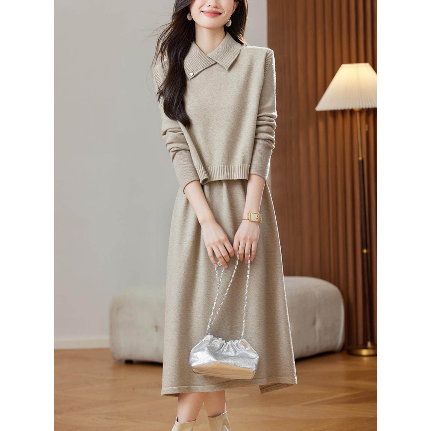 两件套针织连衣裙女长款秋冬中年妈妈小个子高级感毛衣打底套装裙