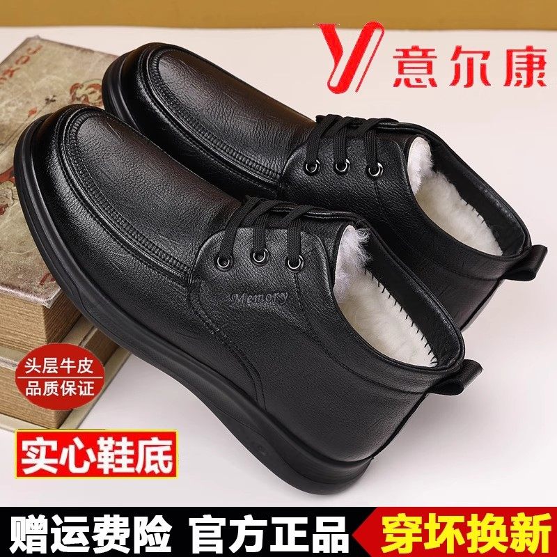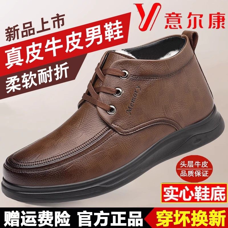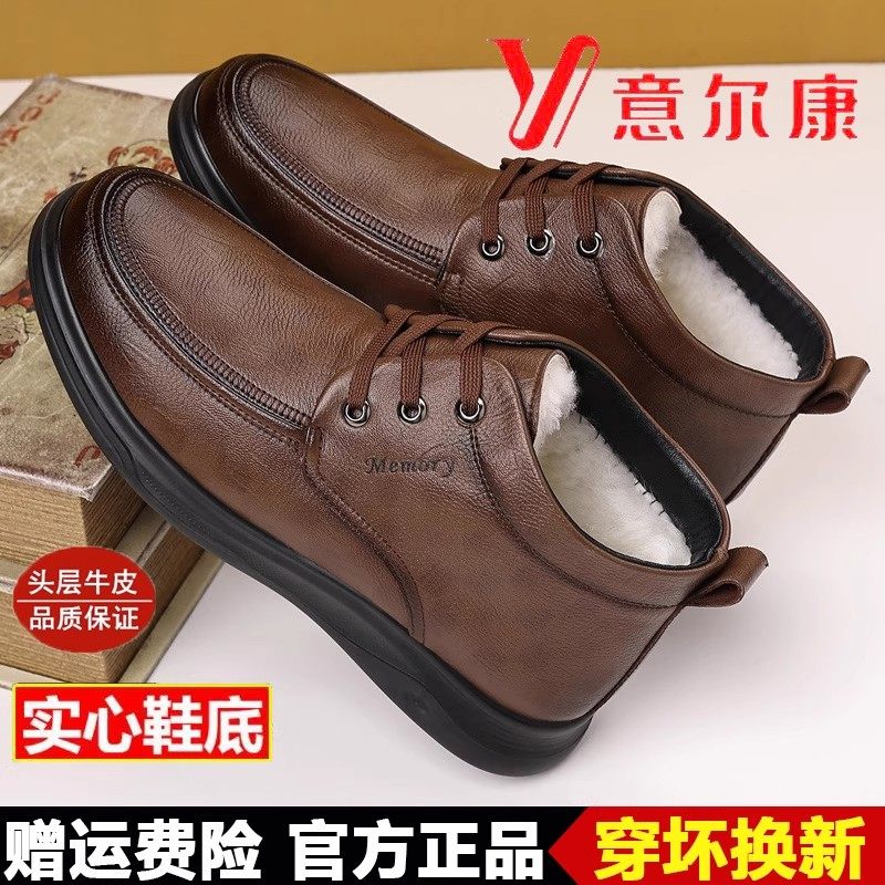 意尔康冬季真皮羊毛一体保暖高帮休闲皮鞋男士加绒套筒棉鞋子大码