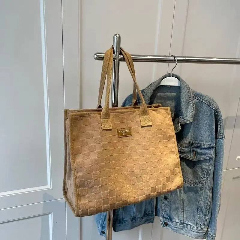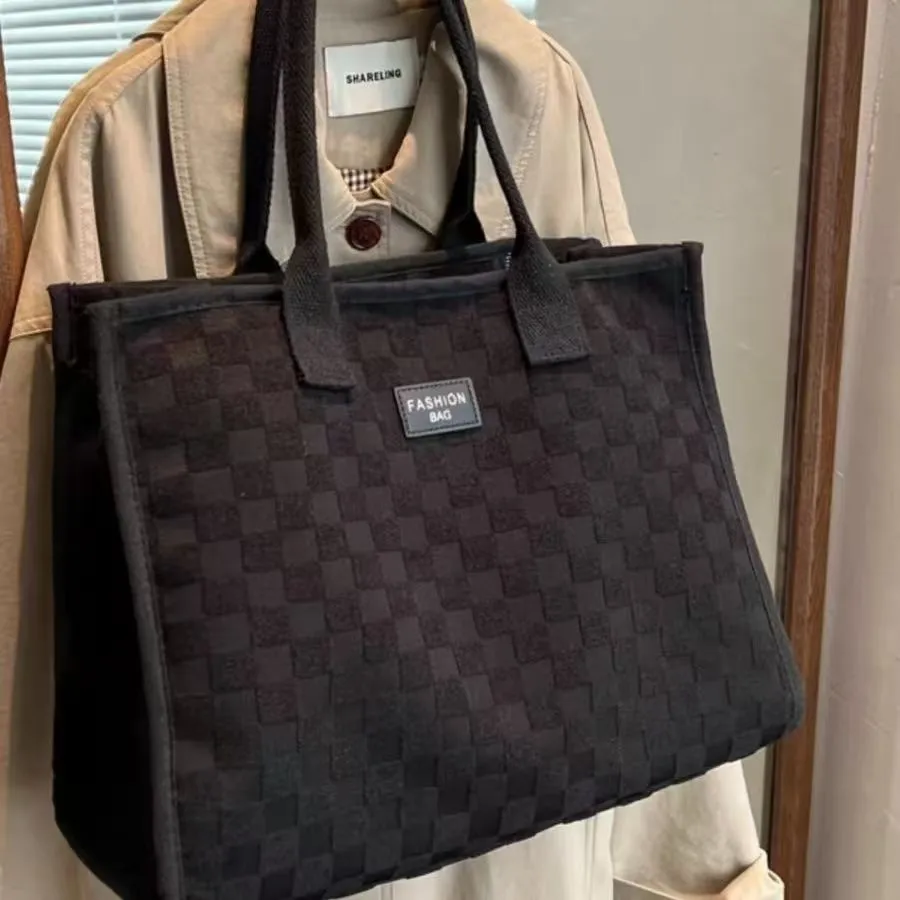 大容量帆布包包女格纹手提托特包时尚外出手提购物袋子纯色拉链袋