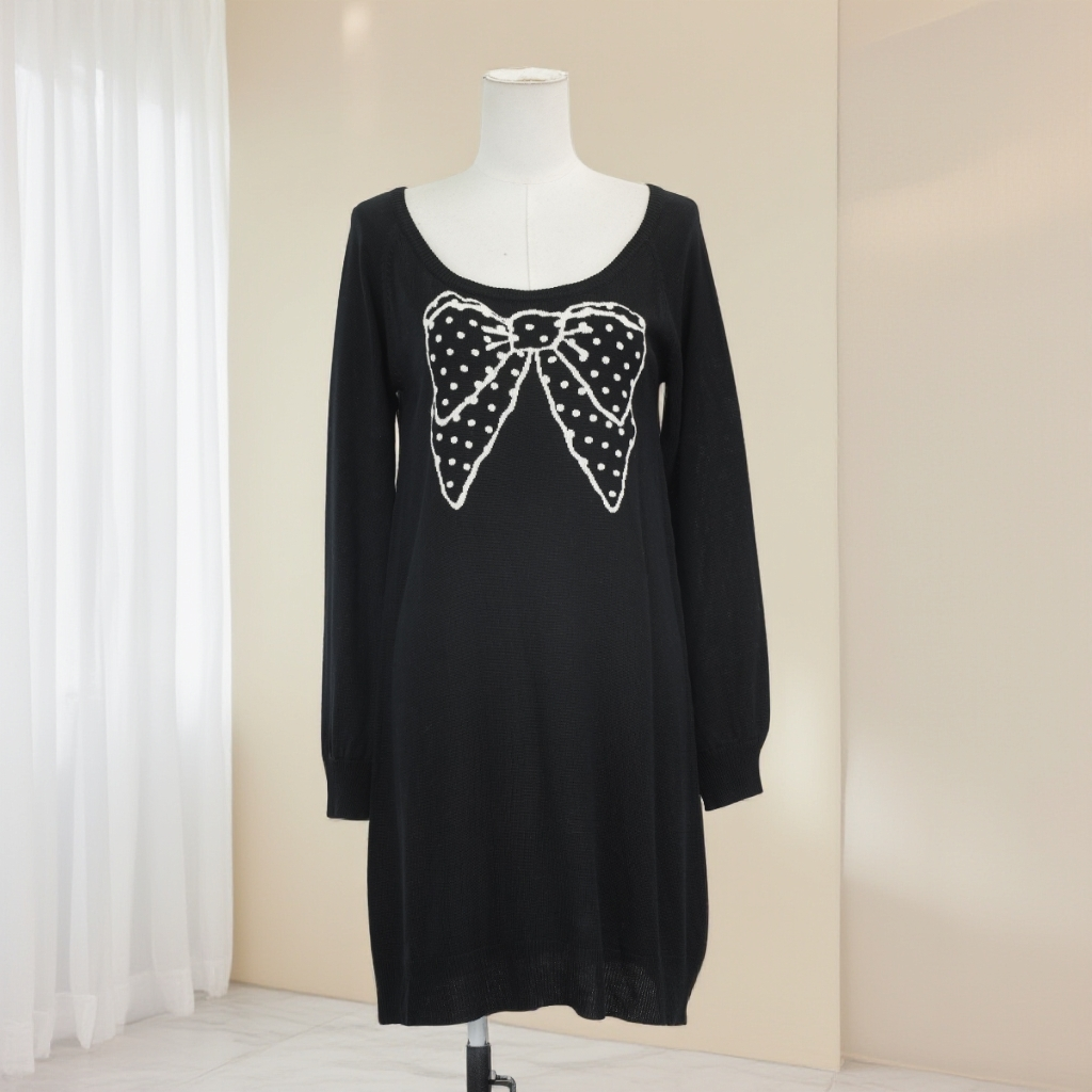 春秋新款蝴蝶结风黑色长袖针织连衣裙女宽松中长款毛衣裙37653