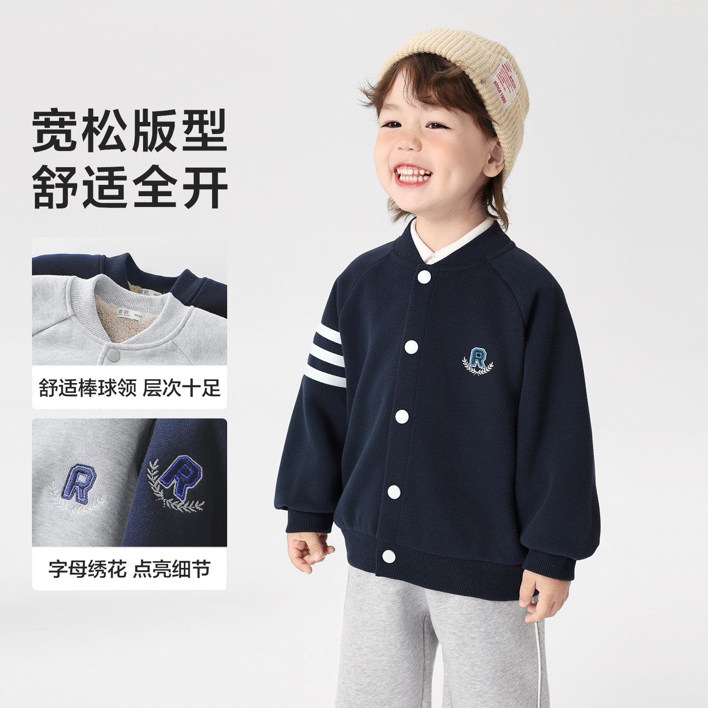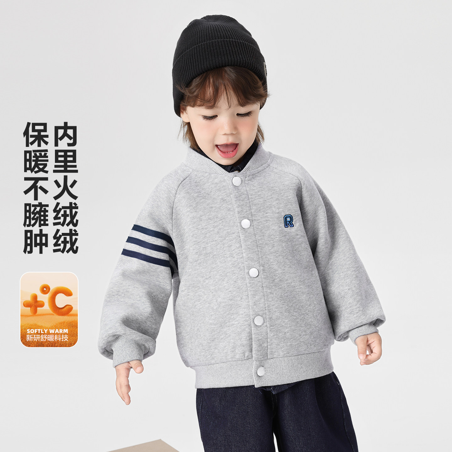 右欧男女童加绒棒球服外套学院风秋冬季新款童装儿童保暖加厚棉衣