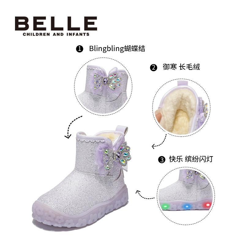 百丽童鞋女童闪灯鞋雪地靴2025冬季新款加绒保暖儿童公主靴大棉鞋