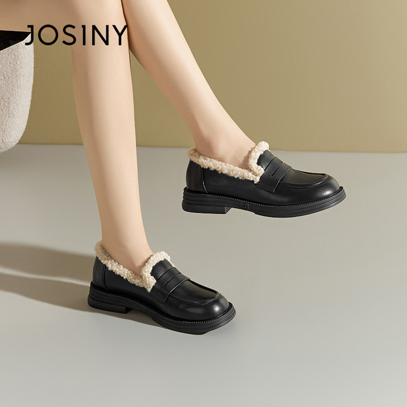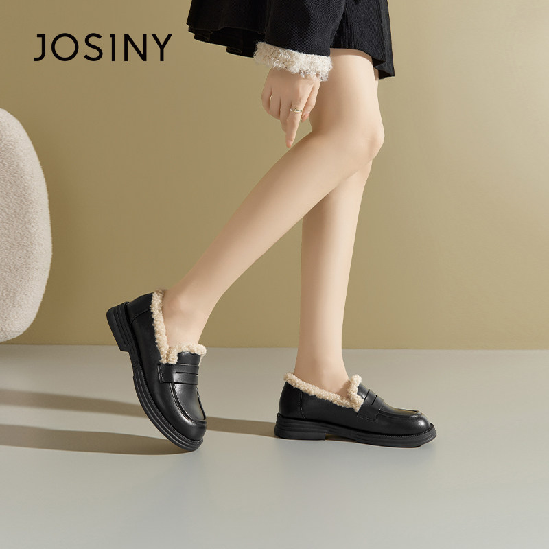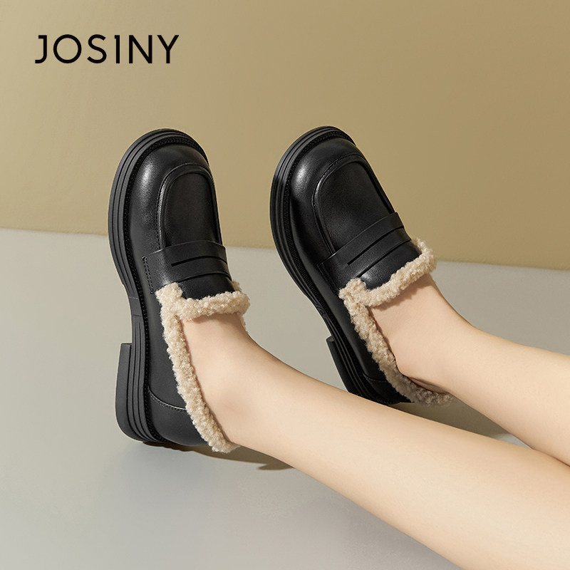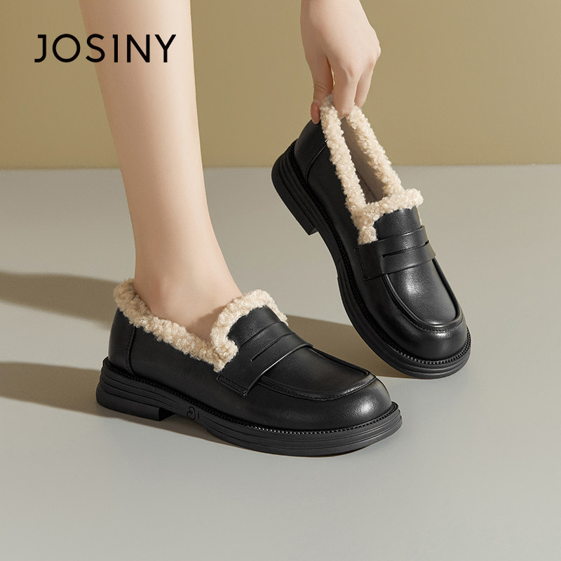 卓诗尼2025秋冬季新款厚底女鞋乐福鞋加绒保暖棉鞋平底圆头豆豆鞋