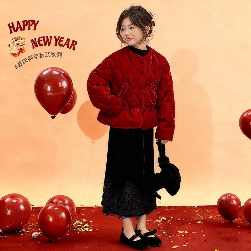 中国风女童冬装2026新款女大童洋气时髦红色棉服外套拜年服套装裙