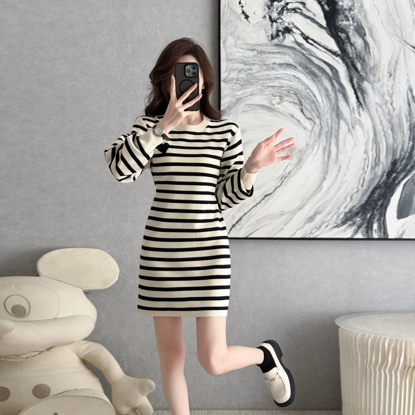 法式设计感条纹百搭连衣裙女秋冬季新款高级感收腰显瘦小个子裙子