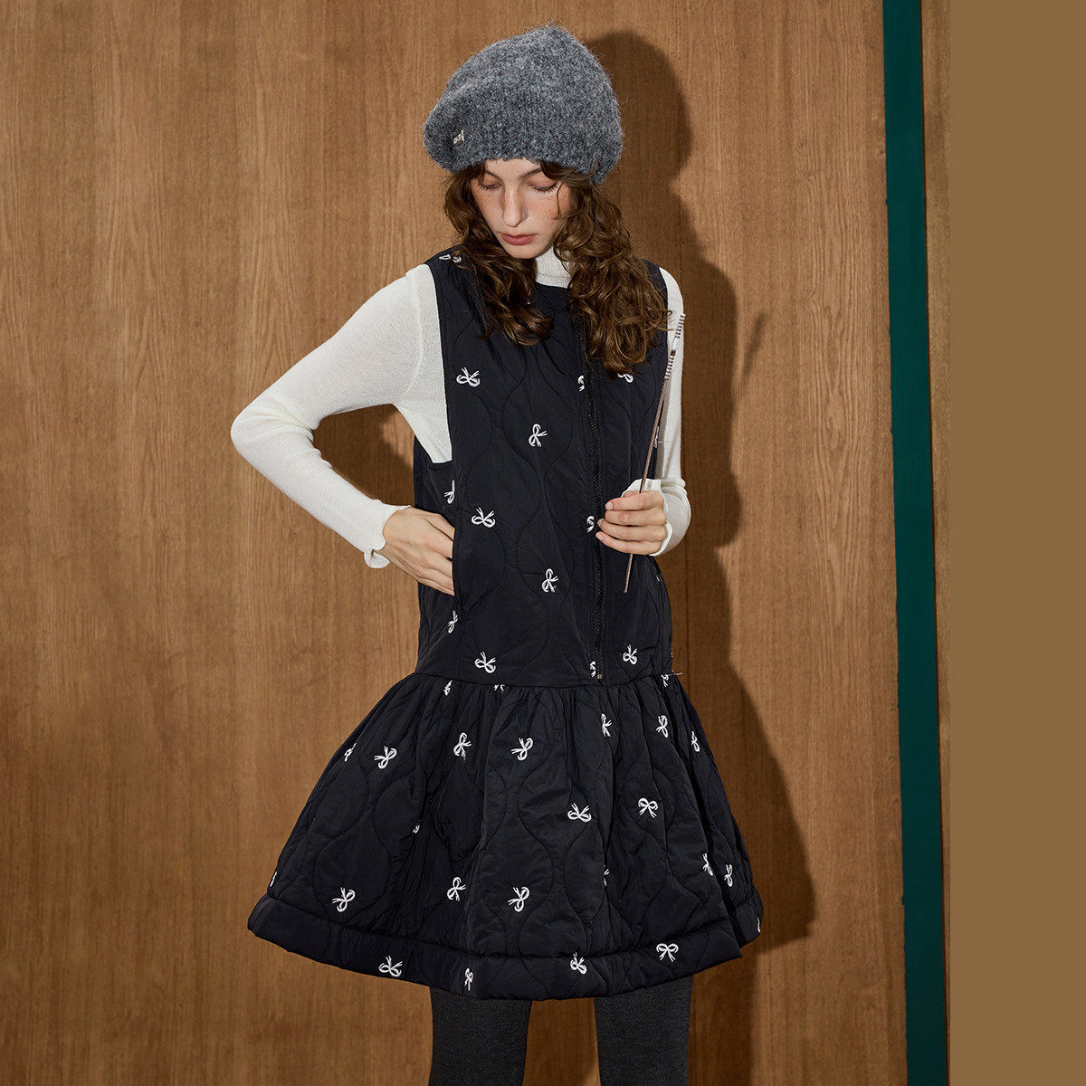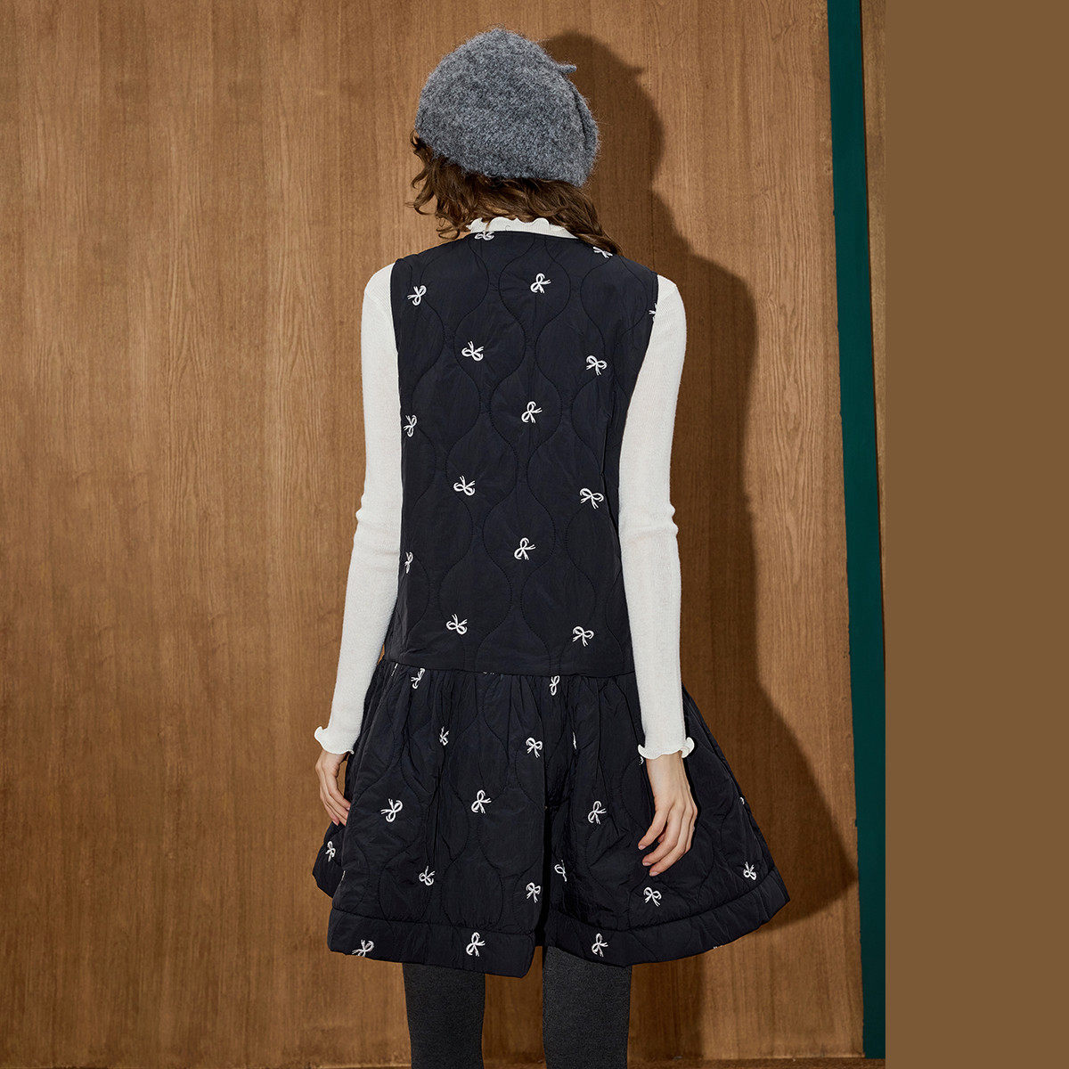 coolhut黑色刺绣蝴蝶结中长款连衣裙夹棉A字设计感2026春季新款女