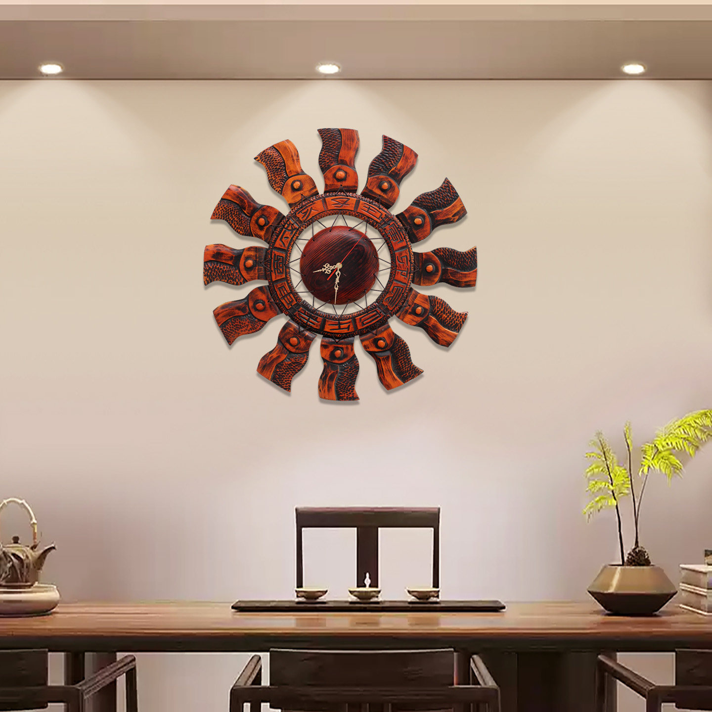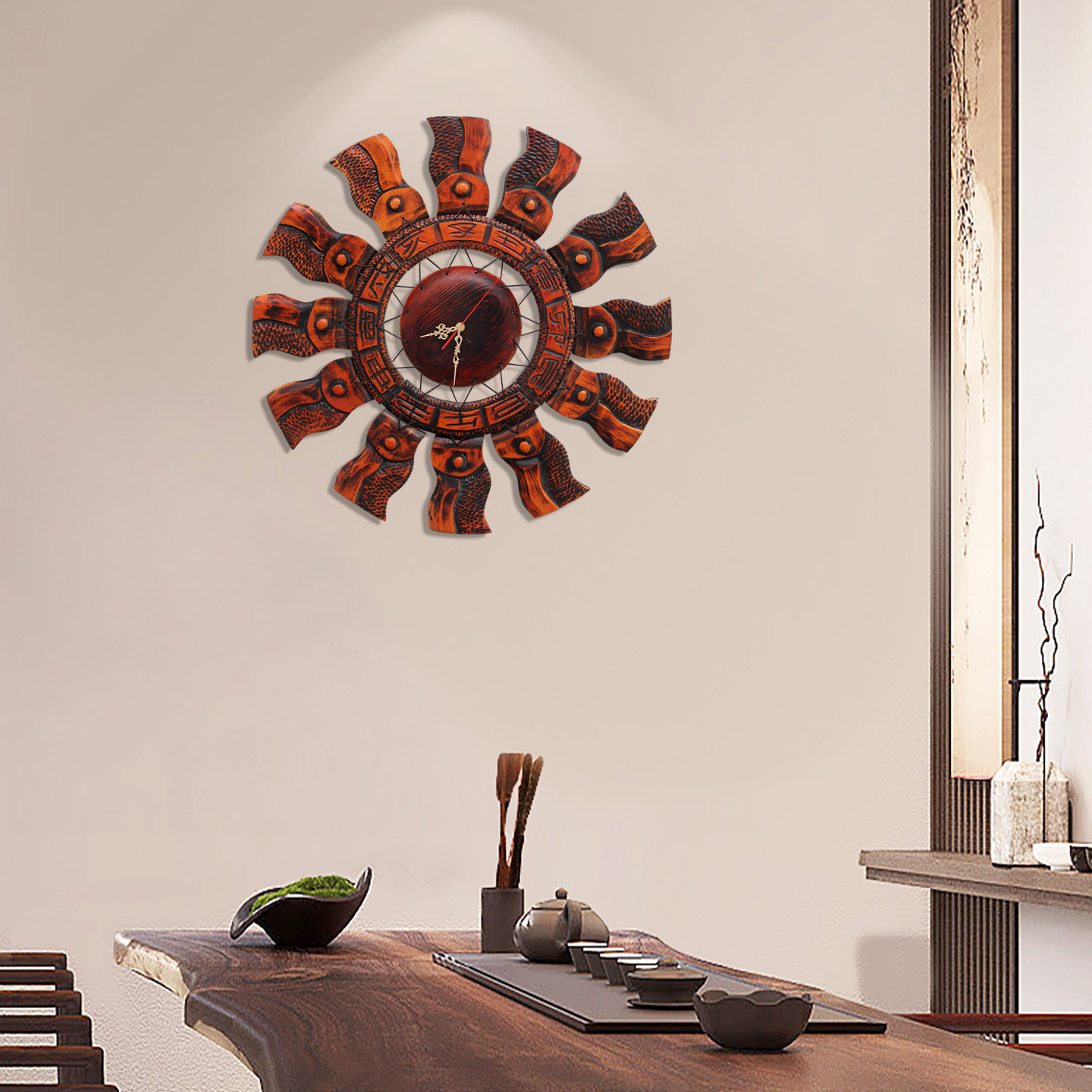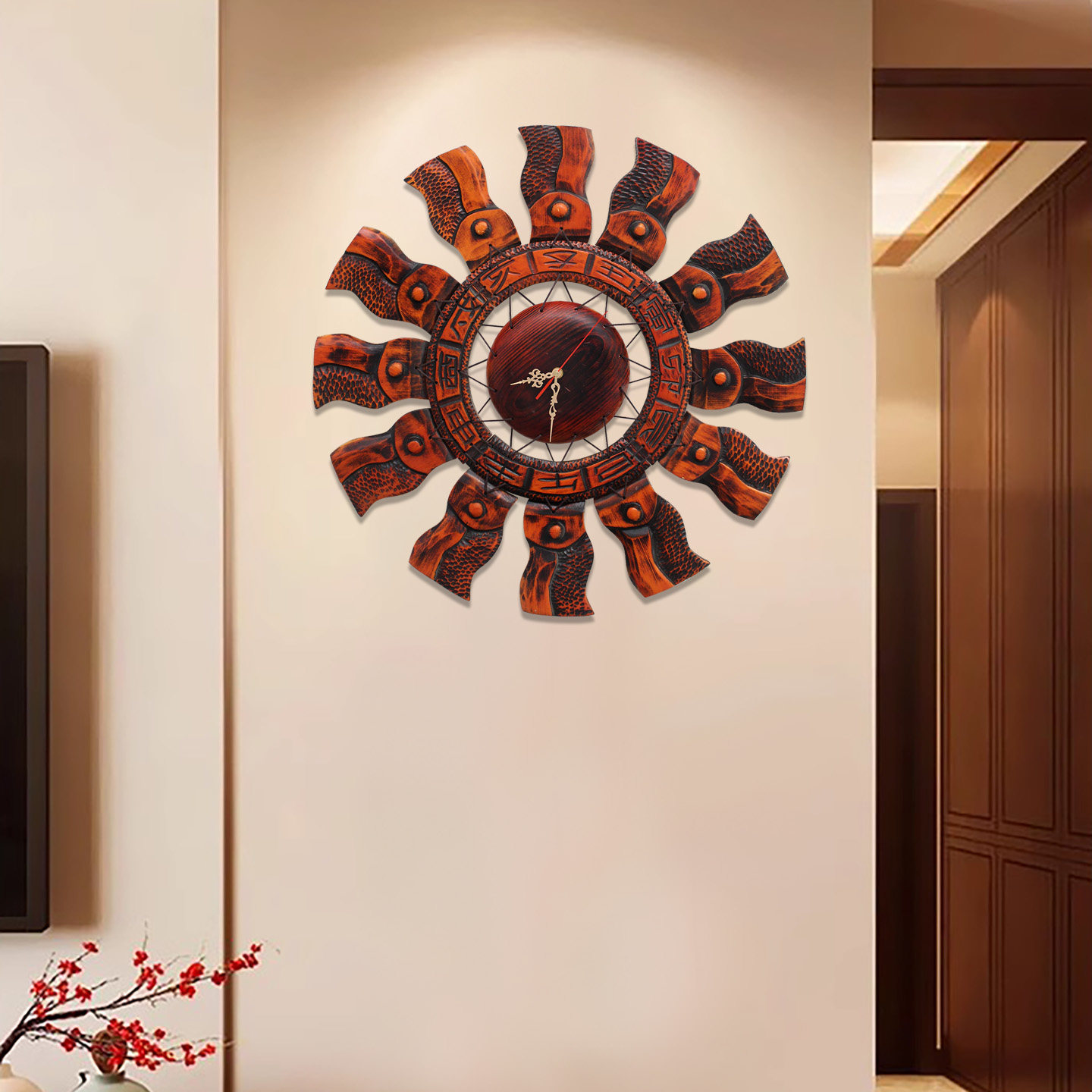 原木墙上装饰家居墙面挂件太阳木雕好日子钟表木质壁挂艺术品挂饰
