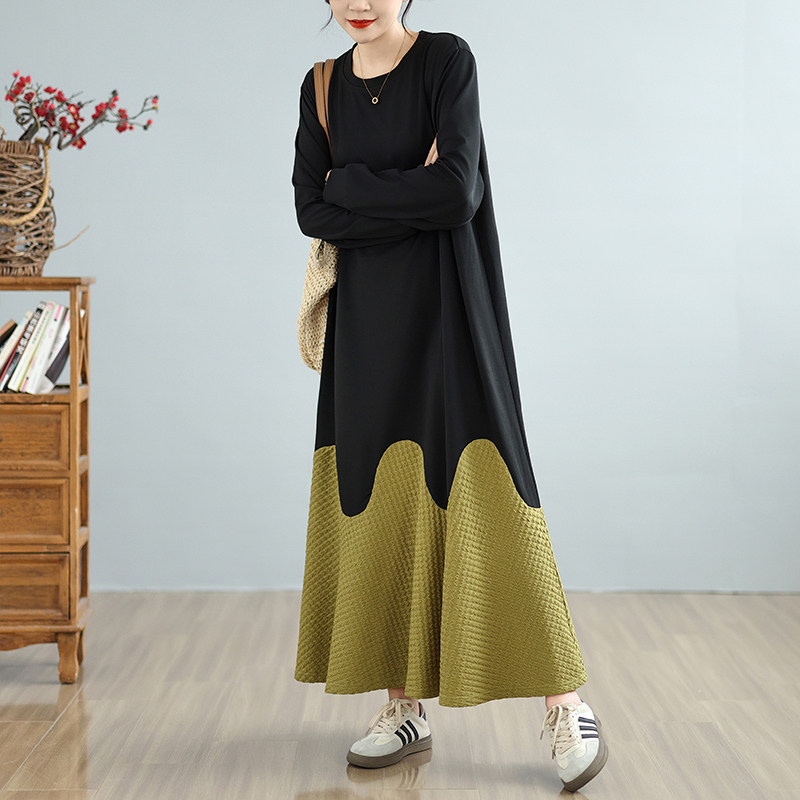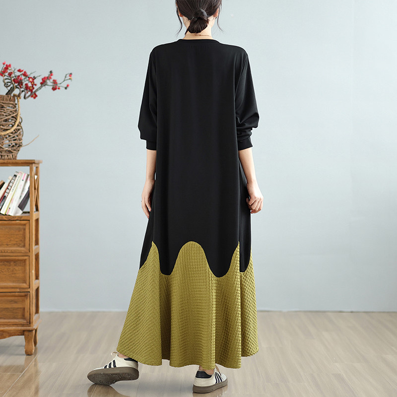 减龄长款过膝卫衣裙女秋冬大码胖mm宽松撞色拼接麦穗纹裙摆连衣裙