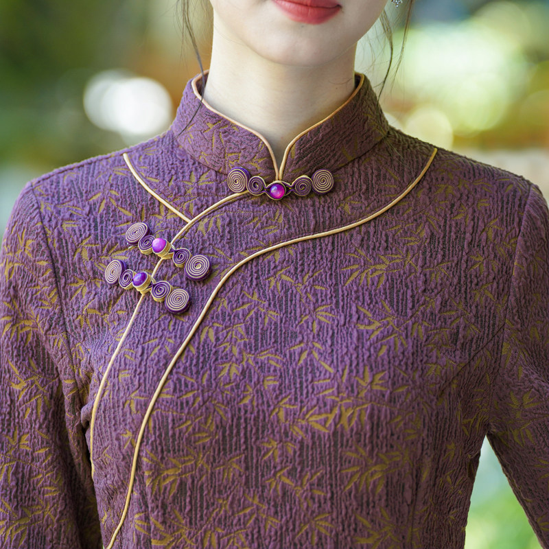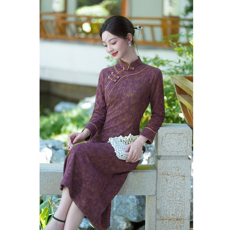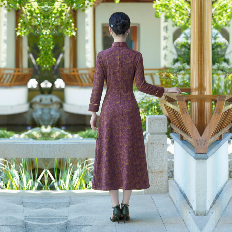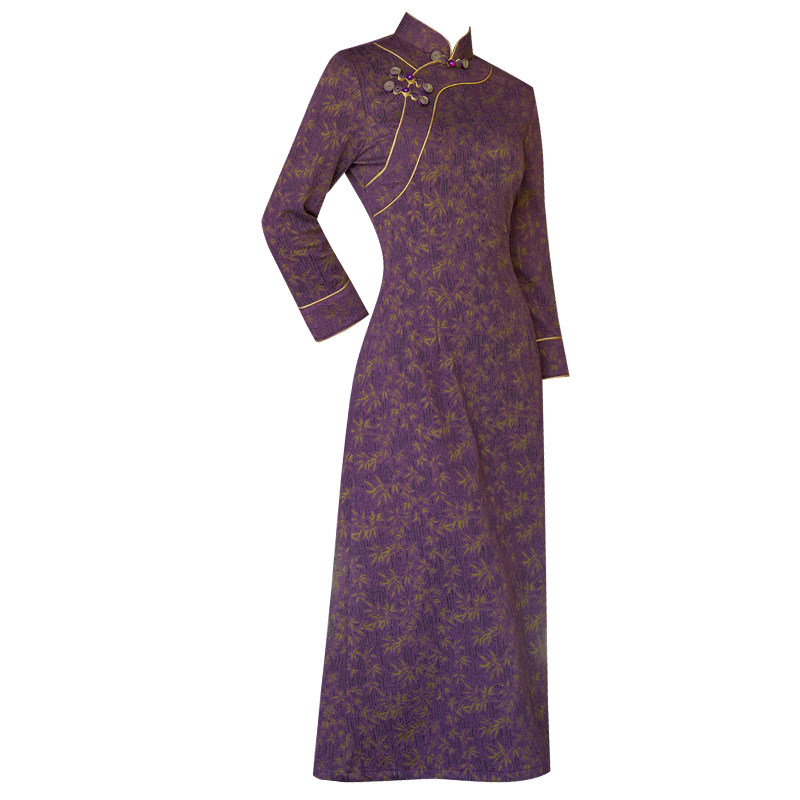 紫色长袖旗袍无开衩改良连衣裙小个子中年女妈妈秋冬季礼服高级感