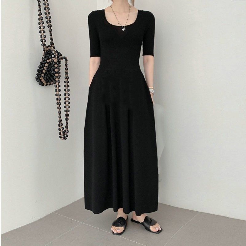 女神黑色芭蕾舞大U领连衣裙A字口袋长款显瘦长裙中袖修身收腰春夏