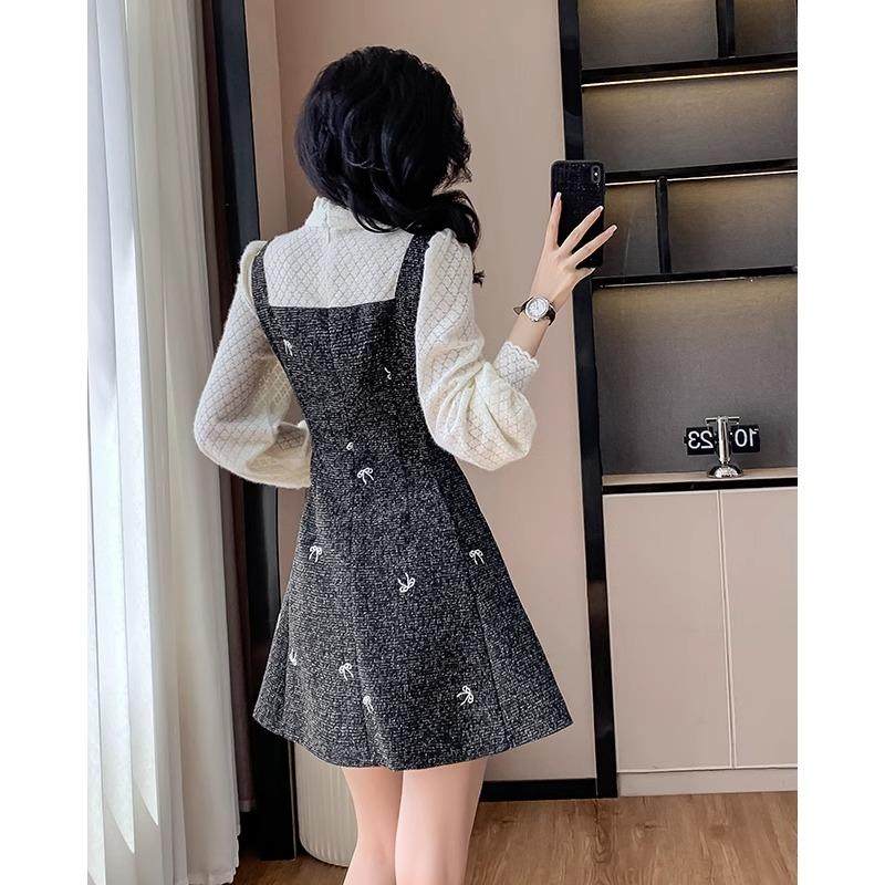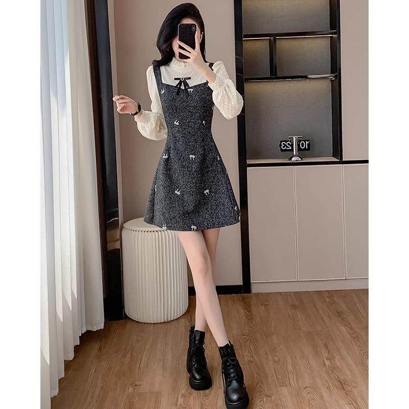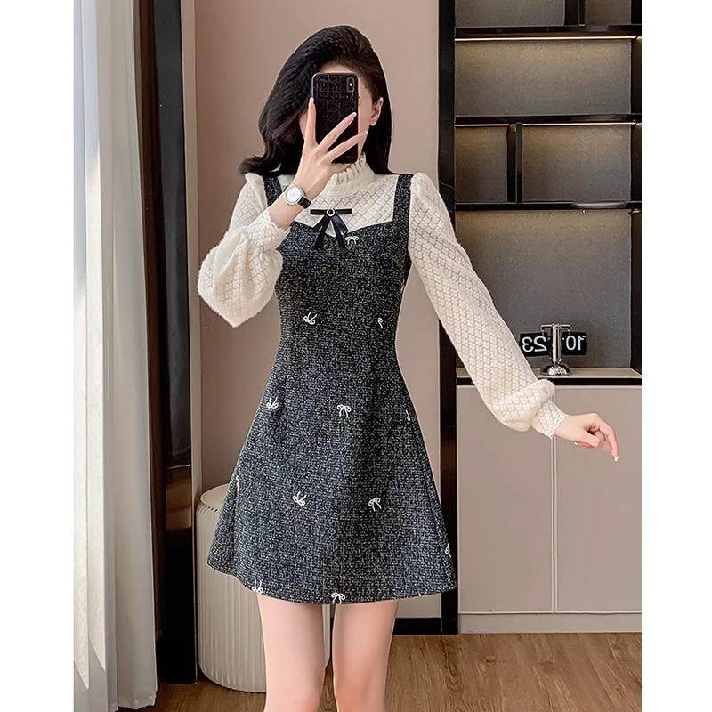 赫小本香风连衣裙女春秋季2025新款小个子假两件套装收腰内搭裙子