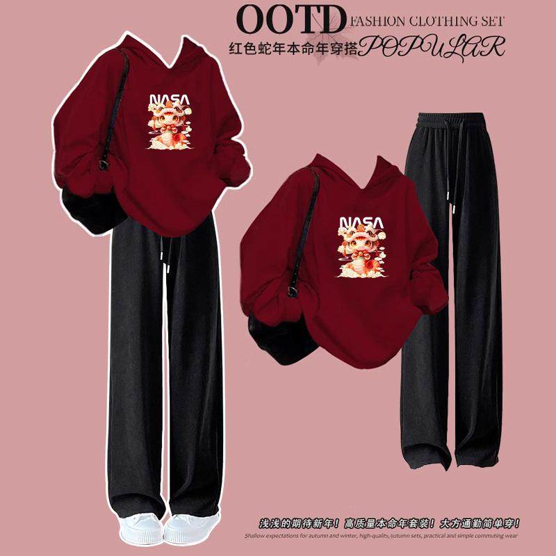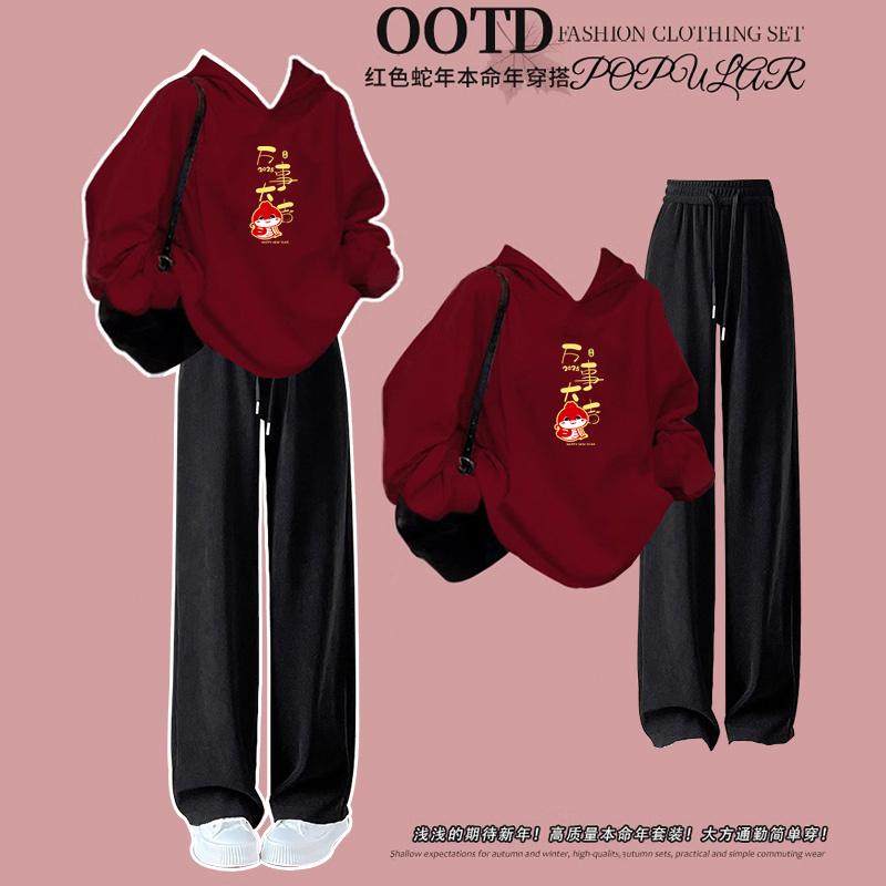 初中生女孩红色加绒卫衣套装秋冬季2025新款女大童学生本命年冬装
