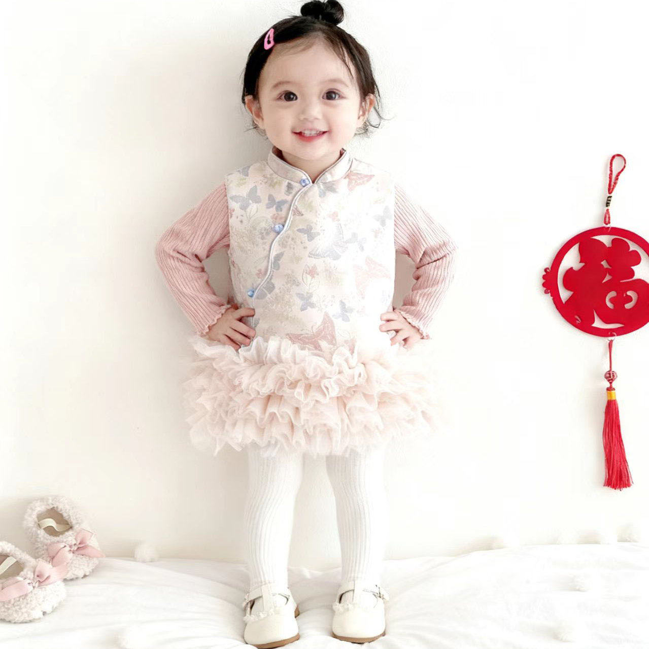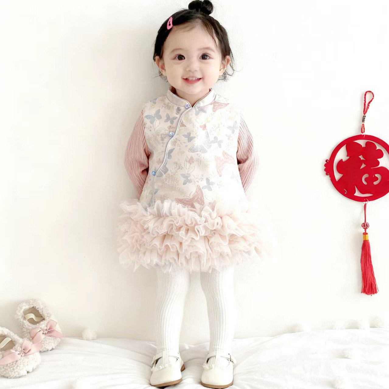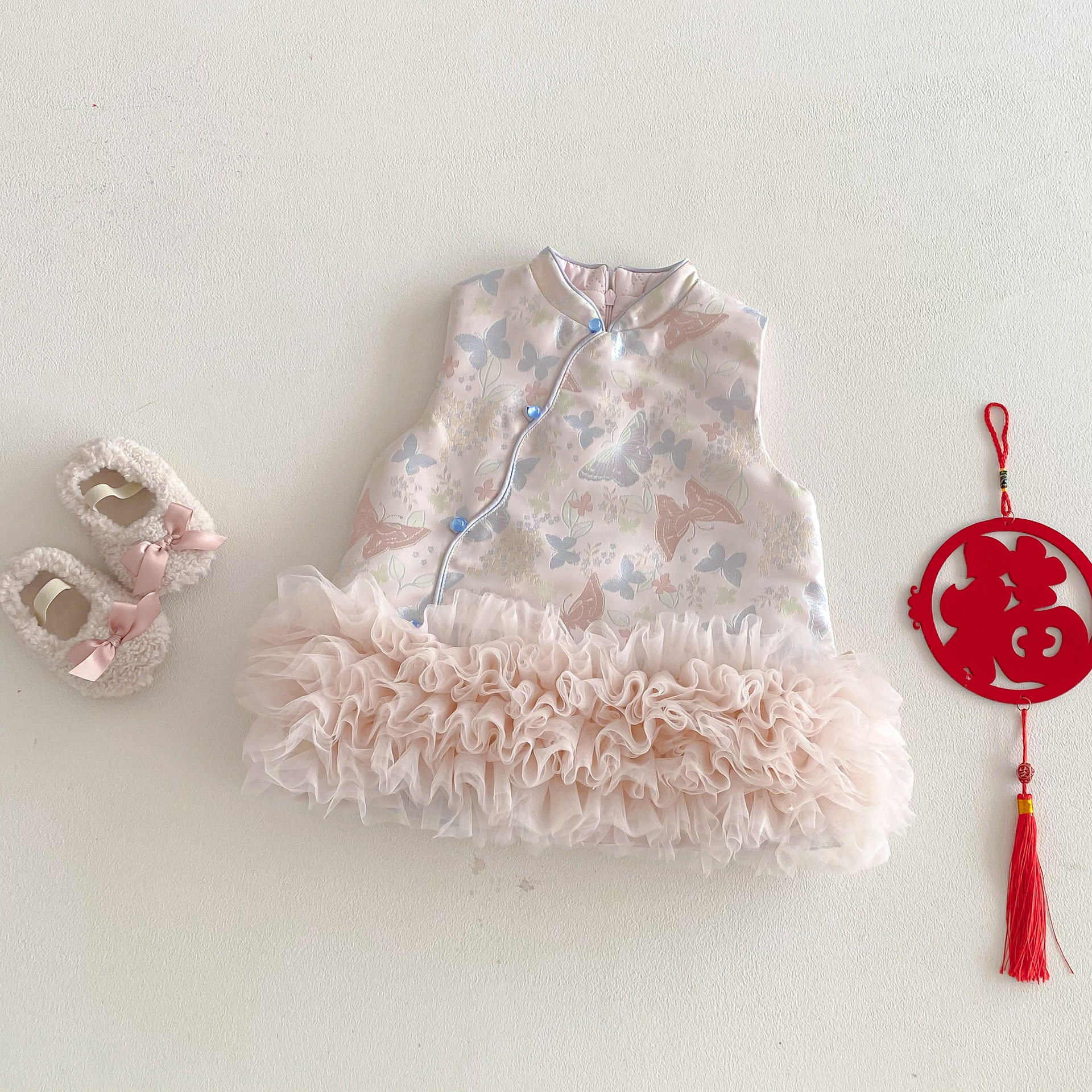 女童连衣裙新中式旗袍粉色背心公主裙女宝宝周岁礼服拜年服套装裙