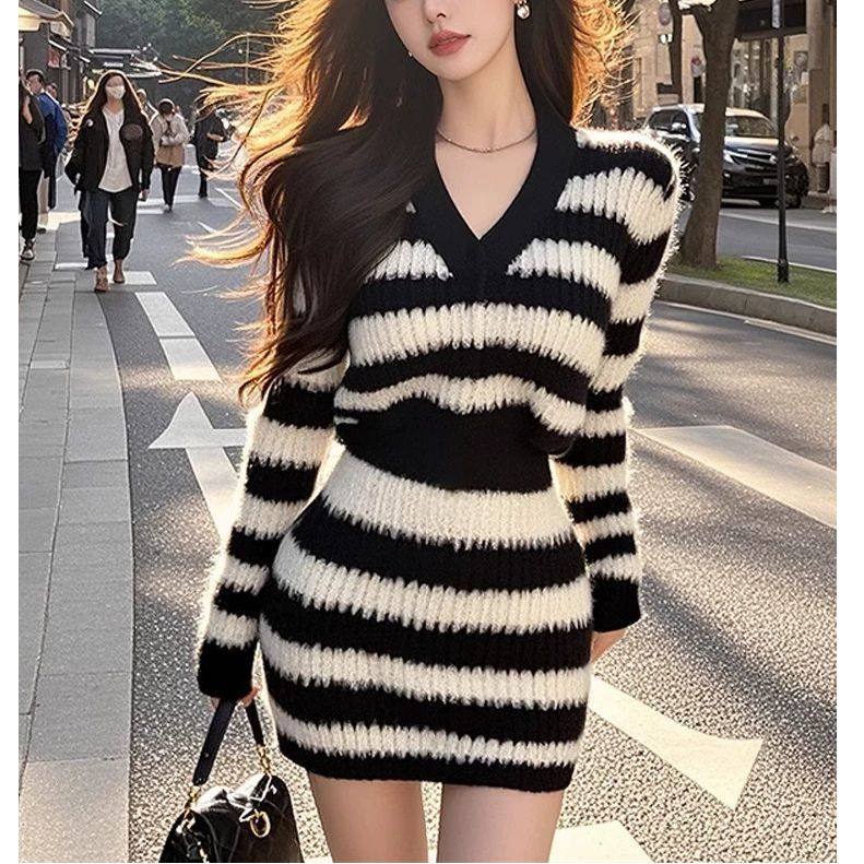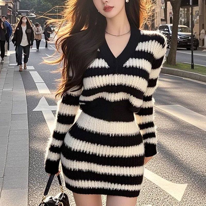 黑白撞色条纹长袖连衣裙女春秋修身显瘦富家千金高级感毛衣包臀裙