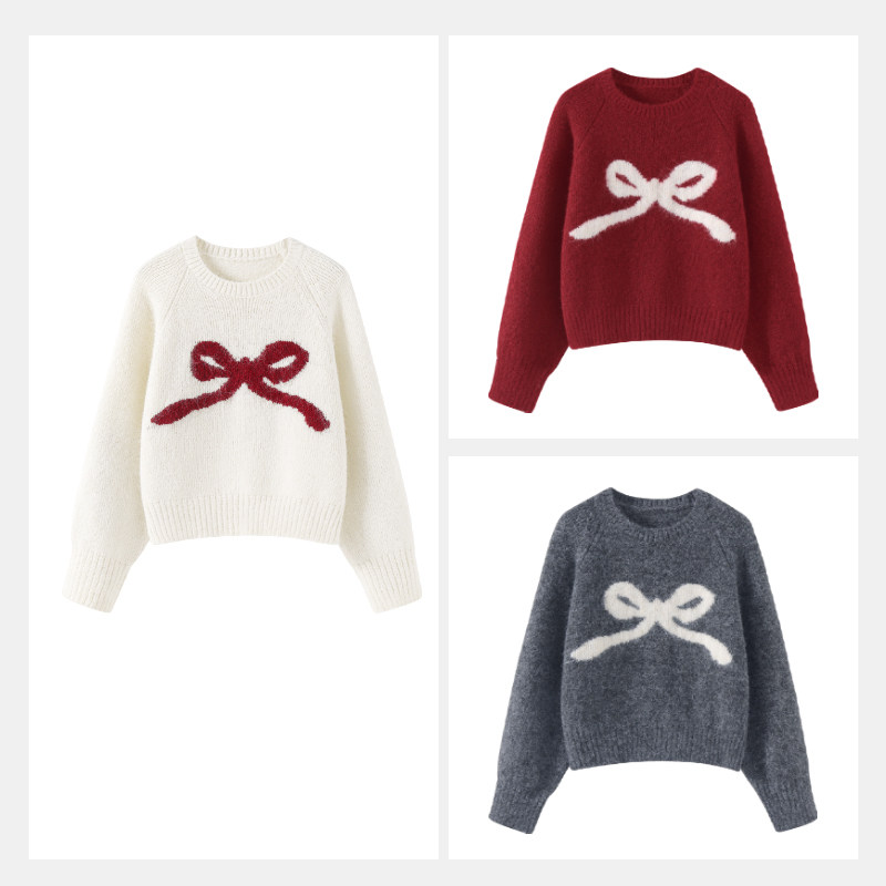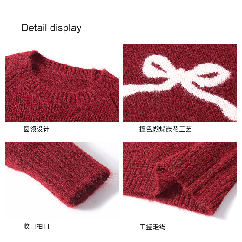 唐狮2026春季女款新年红色针织衫蝴蝶结套头短款毛衫上衣打底衫VB