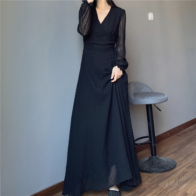 到脚踝的超长款连衣裙 秋冬内搭V领打底裙 长袖波点收腰拖地长裙