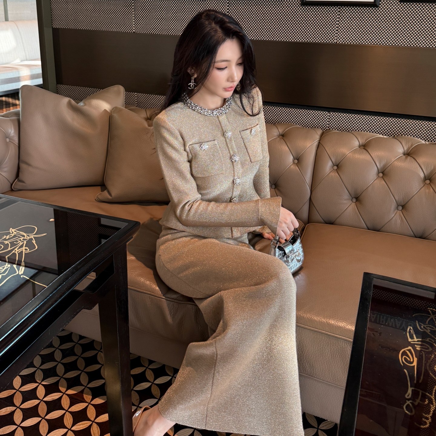 明星同款贵妇名媛温柔小香风修身显瘦长袖金色针织连衣裙秋冬新品