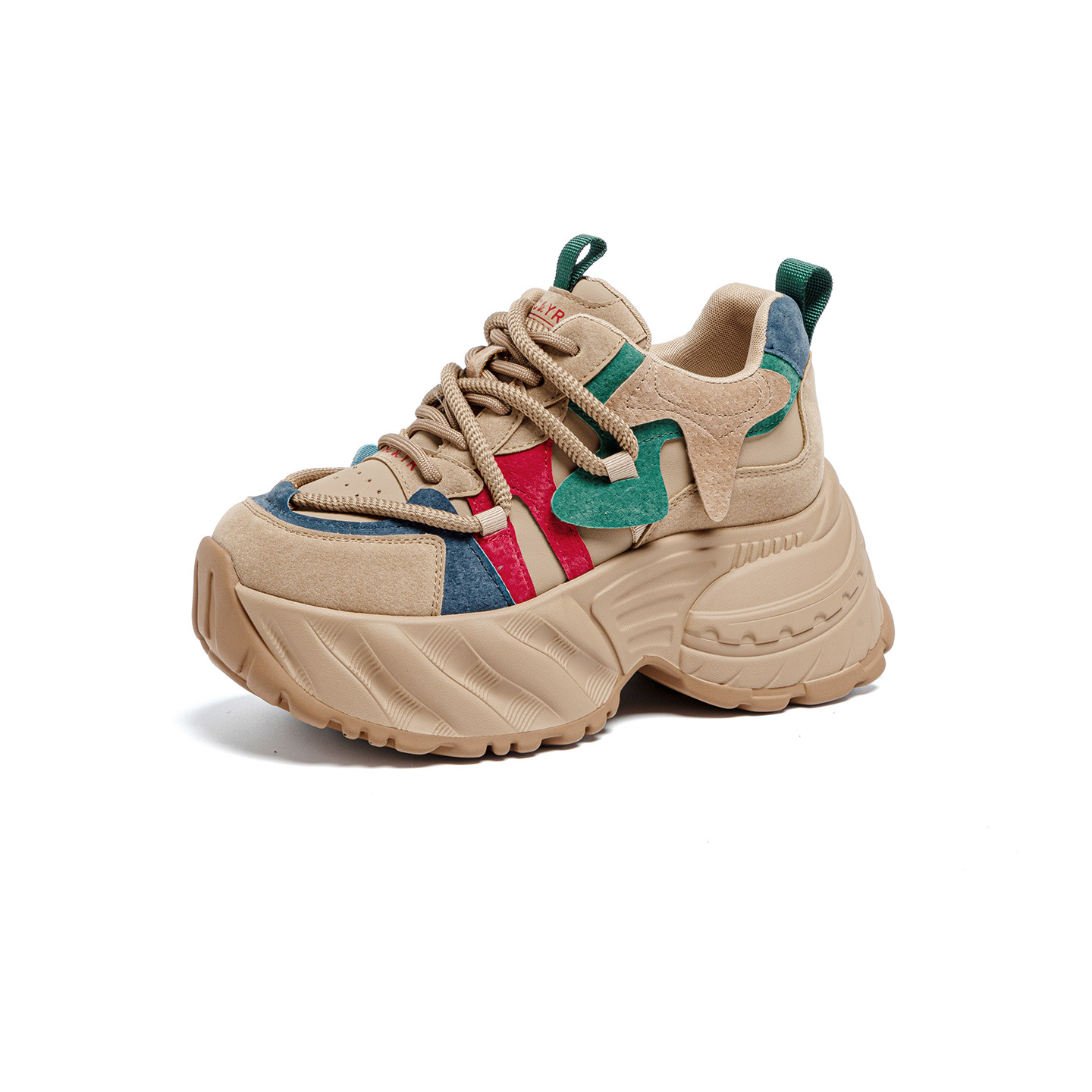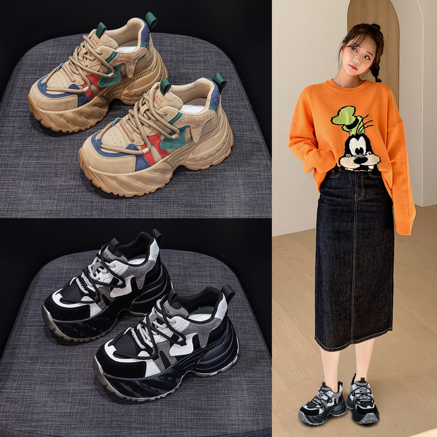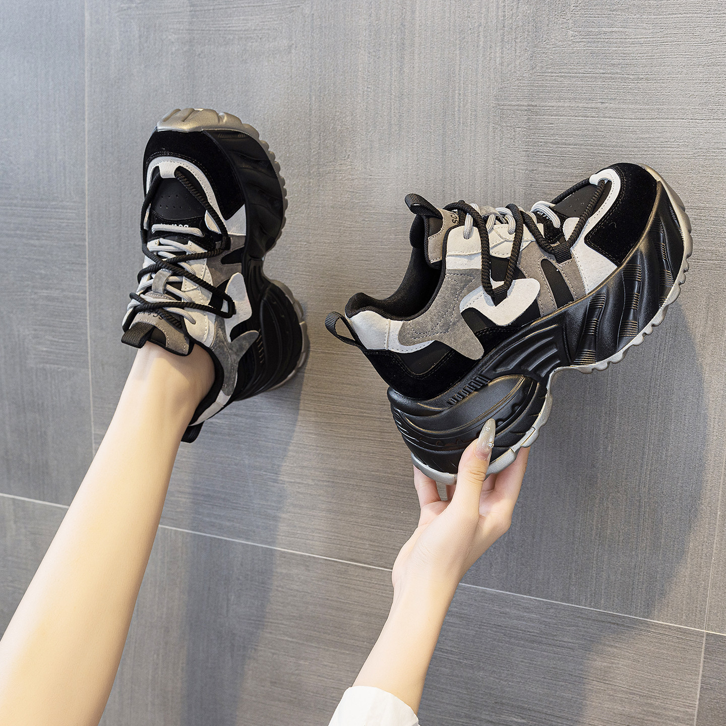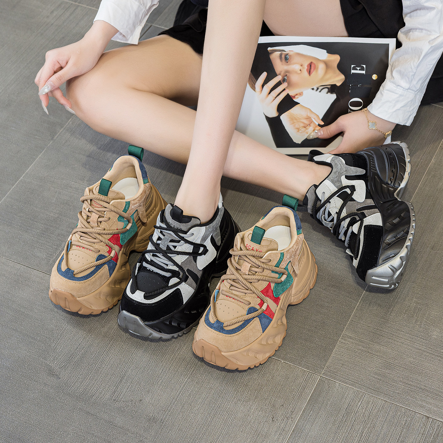 ZFCQ新款厚底内增高拼色老爹鞋女款真皮2025秋冬显脚小8cm运动鞋