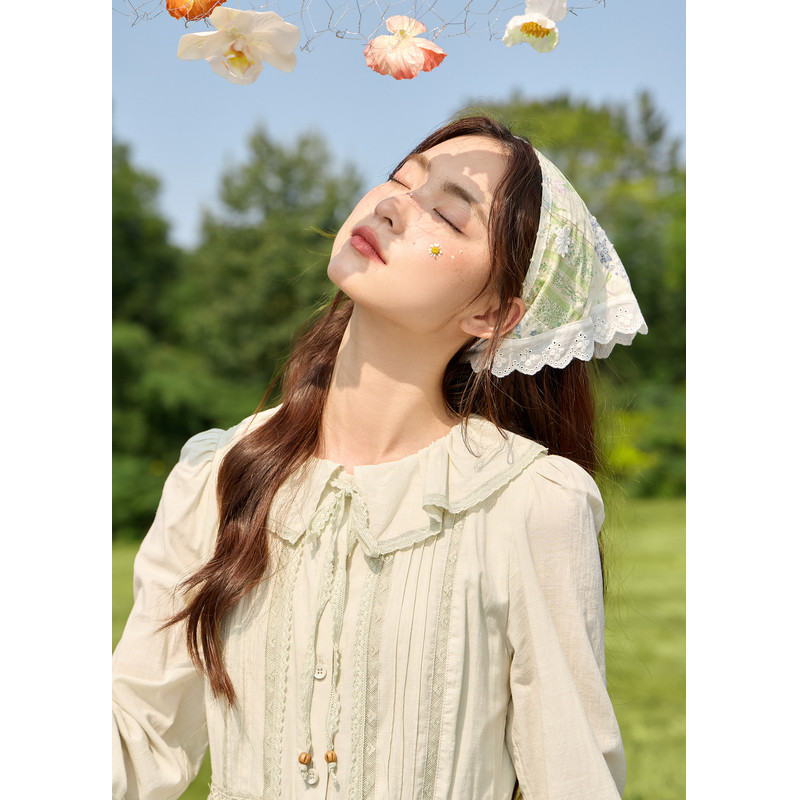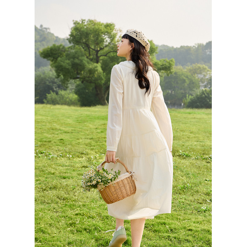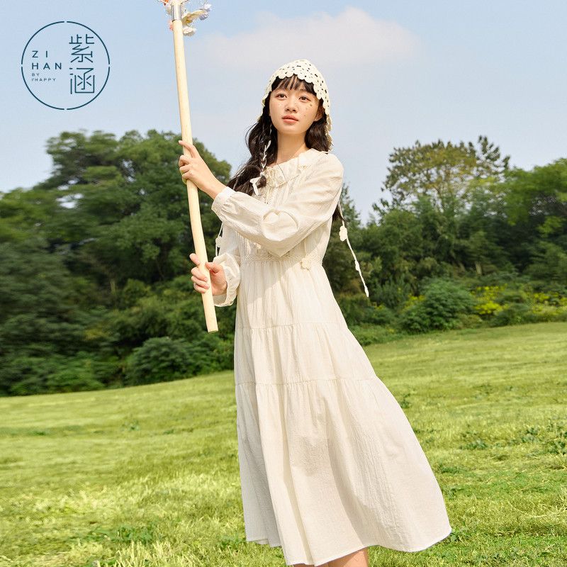 紫涵圆领拼接长袖连衣裙女春秋季新款法式甜美休闲收腰纯棉a字裙