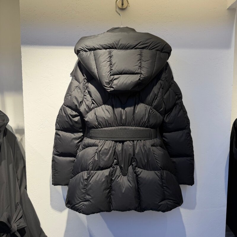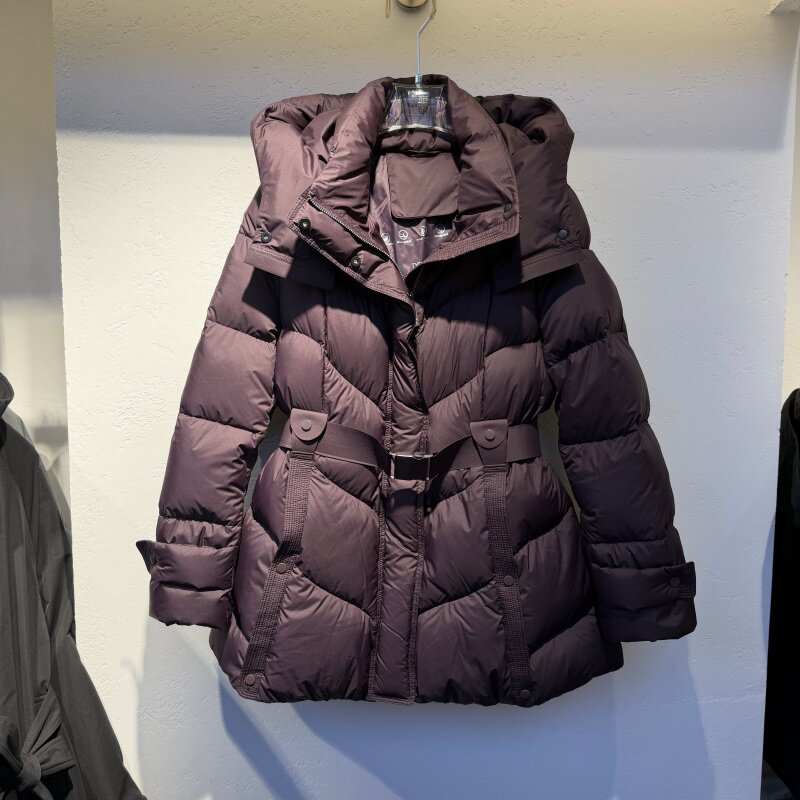 2025年冬装新款流行女装90鹅绒羽绒服连帽领配腰带保暖显瘦磁吸扣