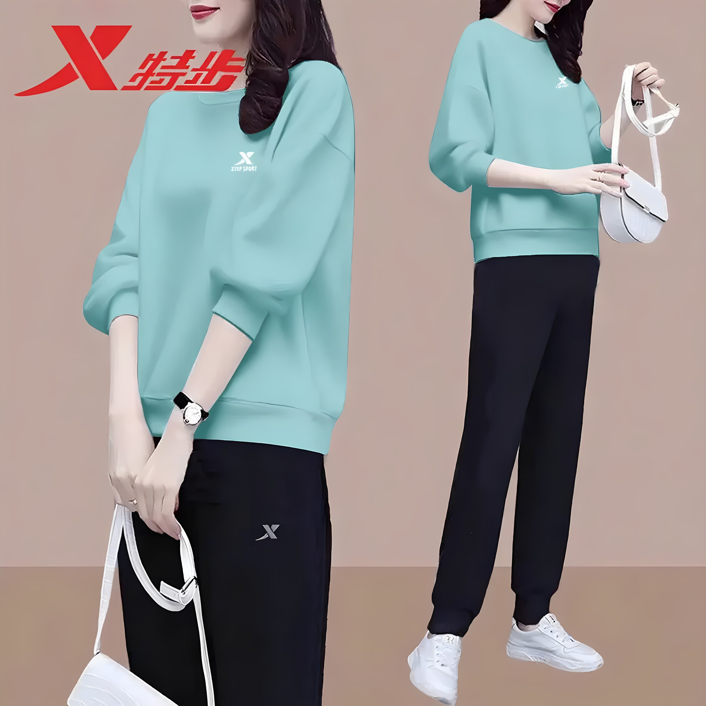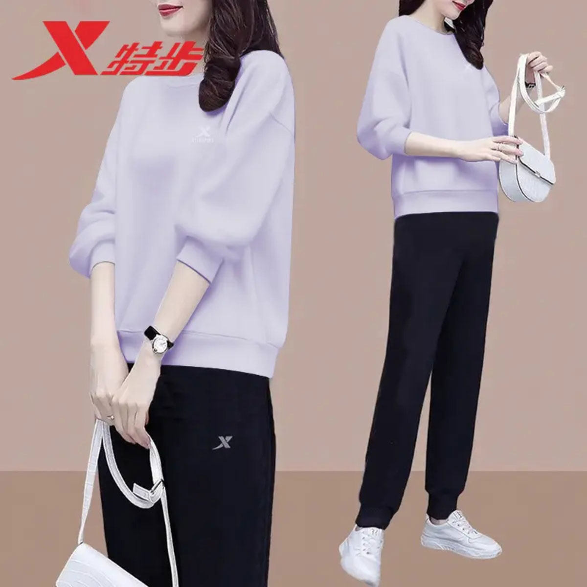 特步卫衣套装女款春季针织跑步长袖卫裤2026新款纯色休闲运动服女