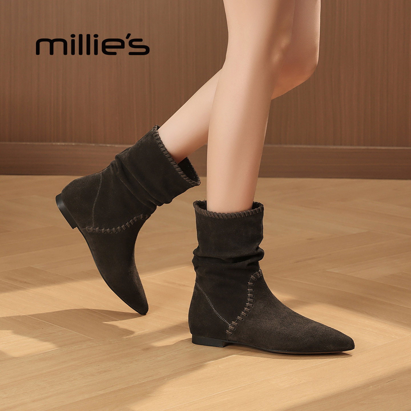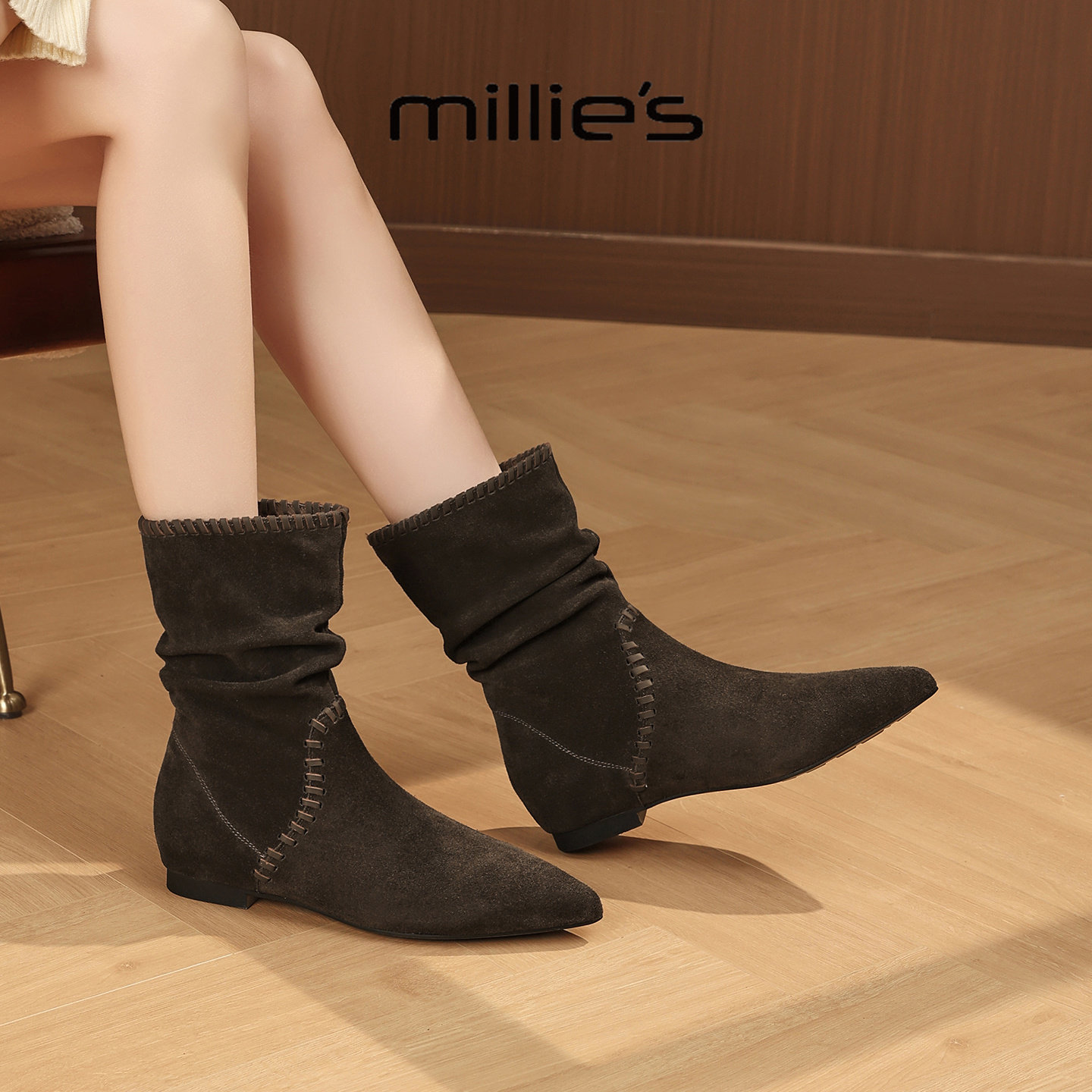 MILLIE'S/妙丽棕色短靴女款新款冬季加绒中筒内增高尖头平底靴子