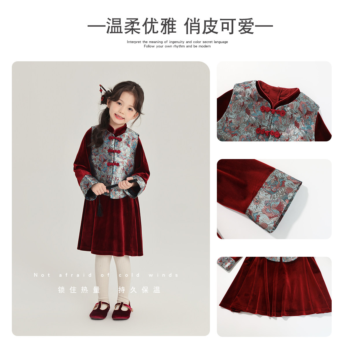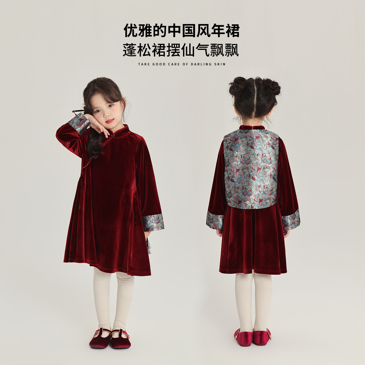 沫沫童装冬装女童拜年套装2026冬季新款儿童新年新中式马甲连衣裙
