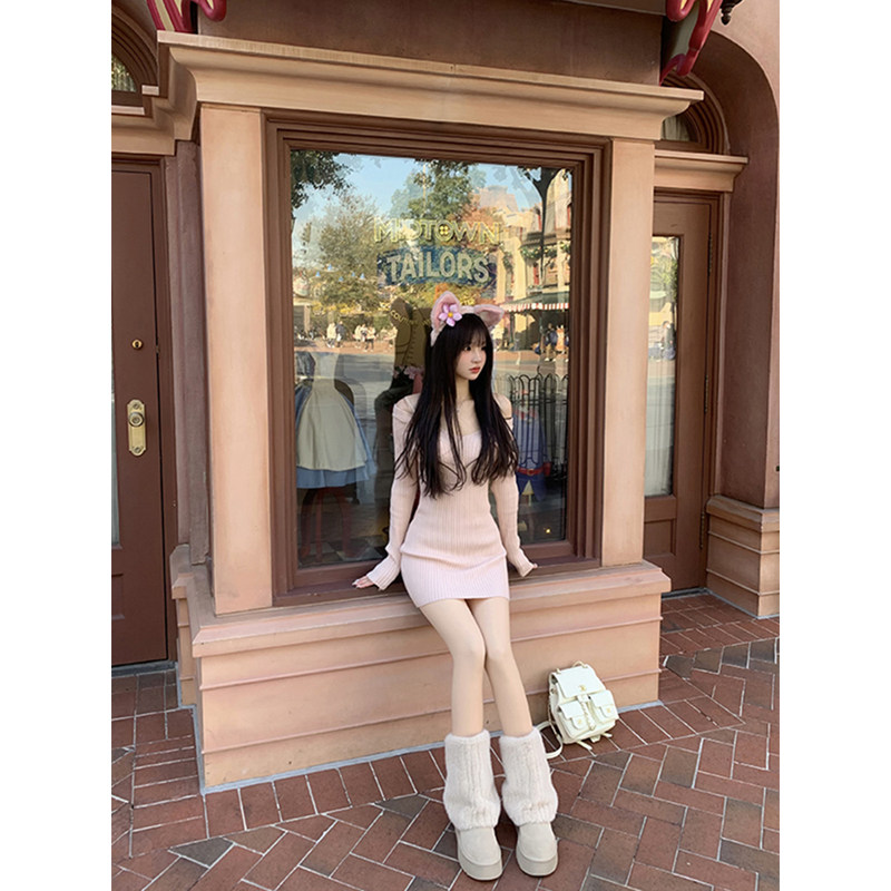 纯欲风性感辣妹v领粉色针织连衣裙春秋显瘦长袖包臀裙毛衣打底裙