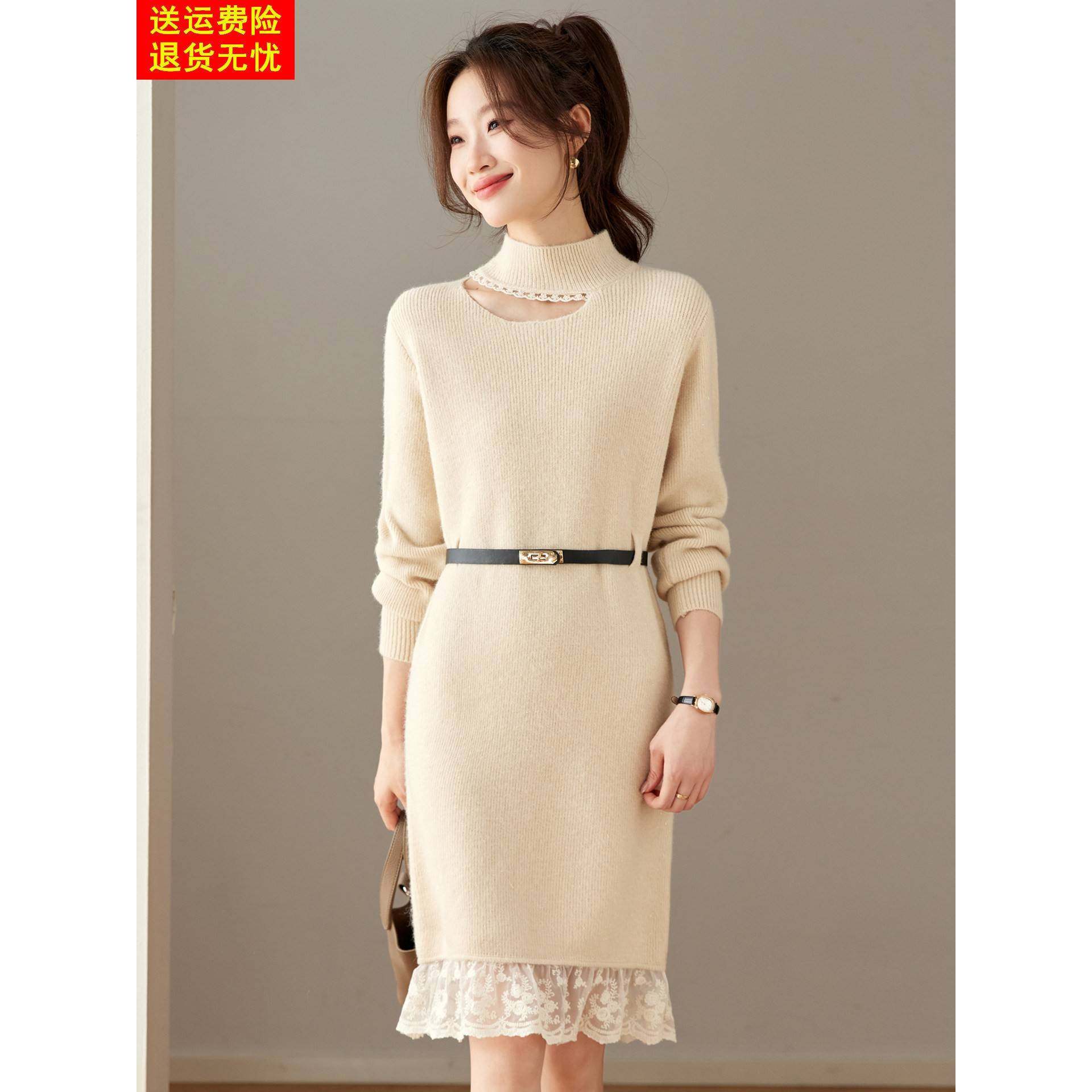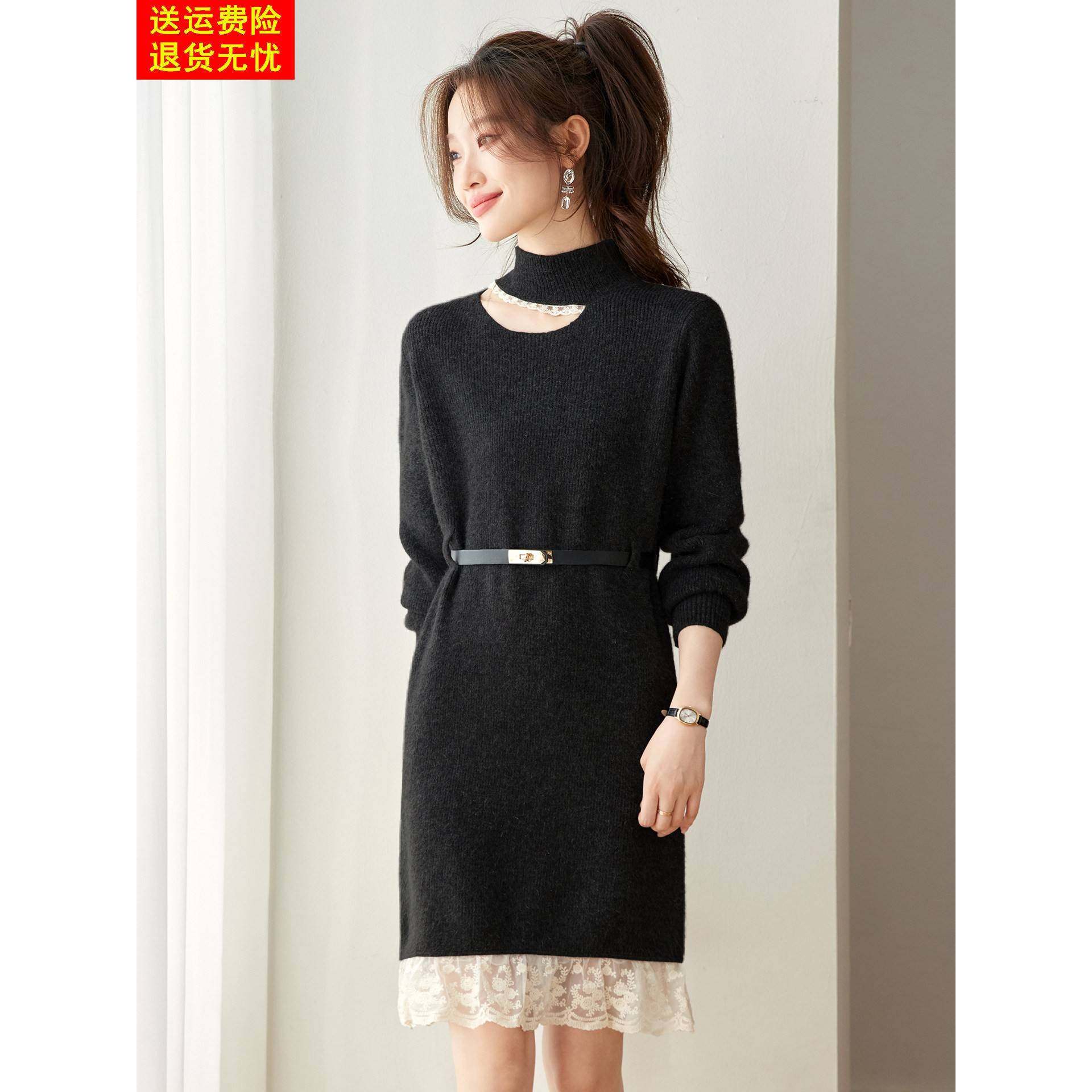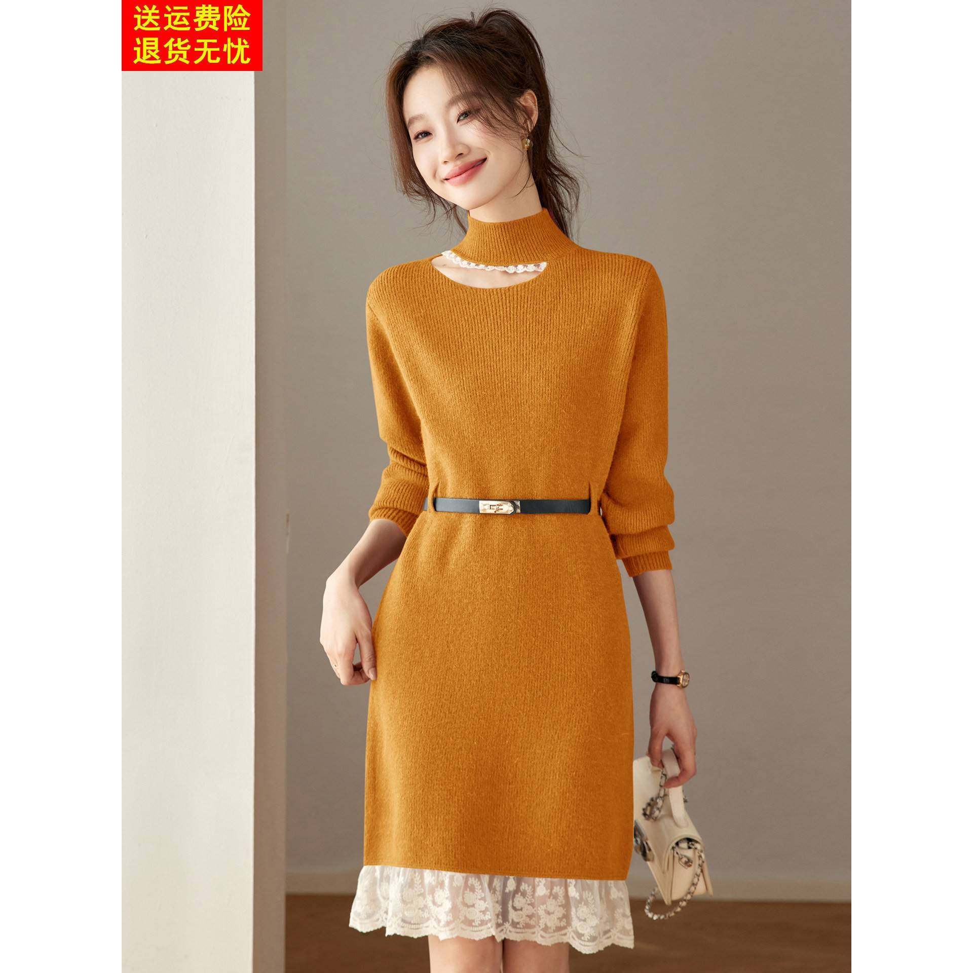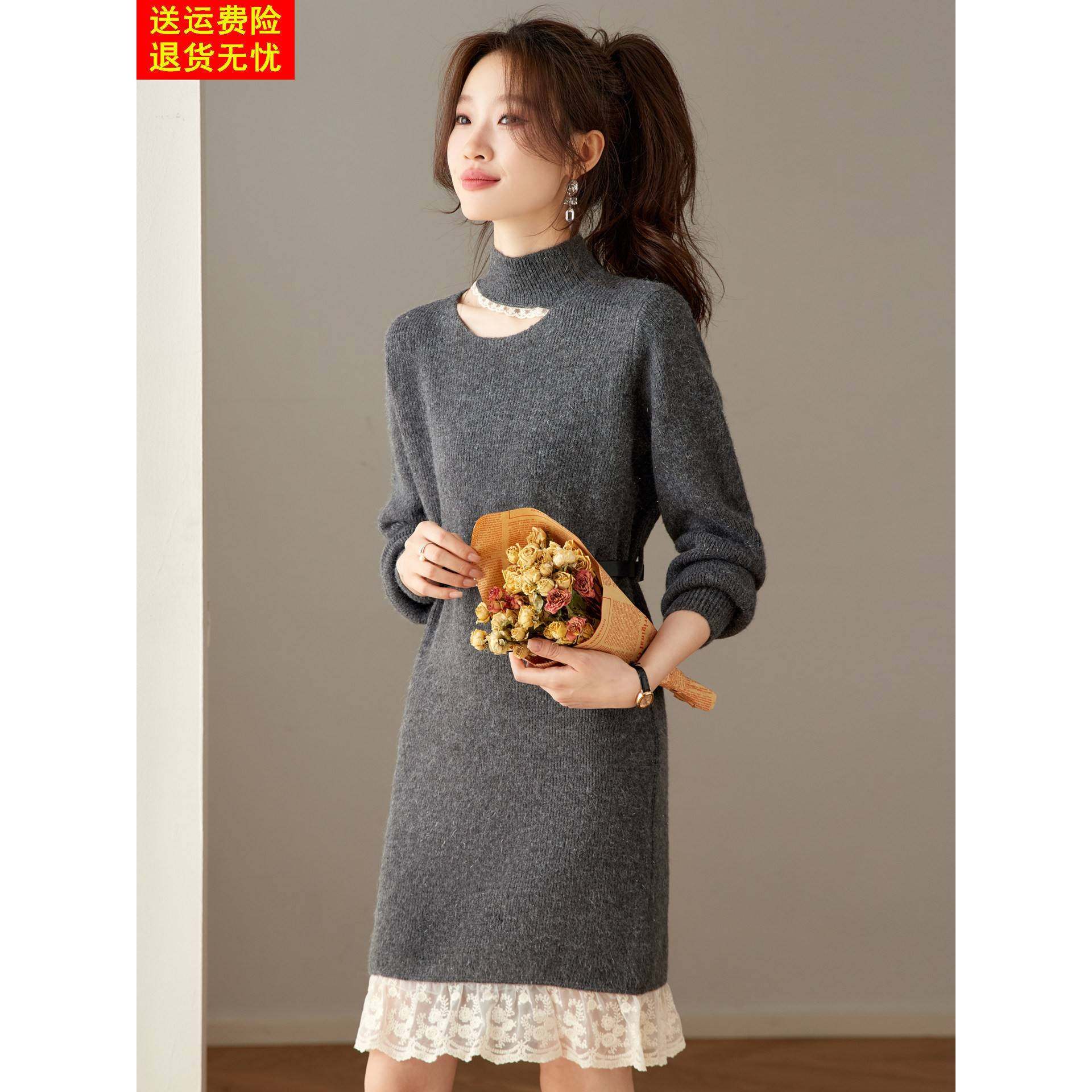 高端好看红色羊毛针织连衣裙秋冬蕾丝拼接打底衫收腰中长款毛衣裙
