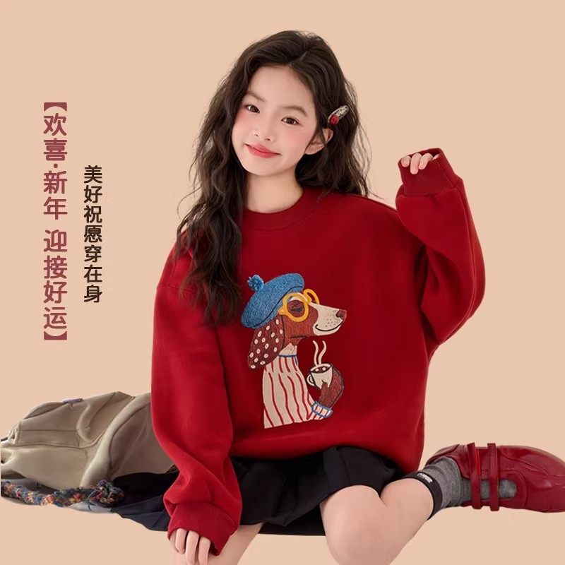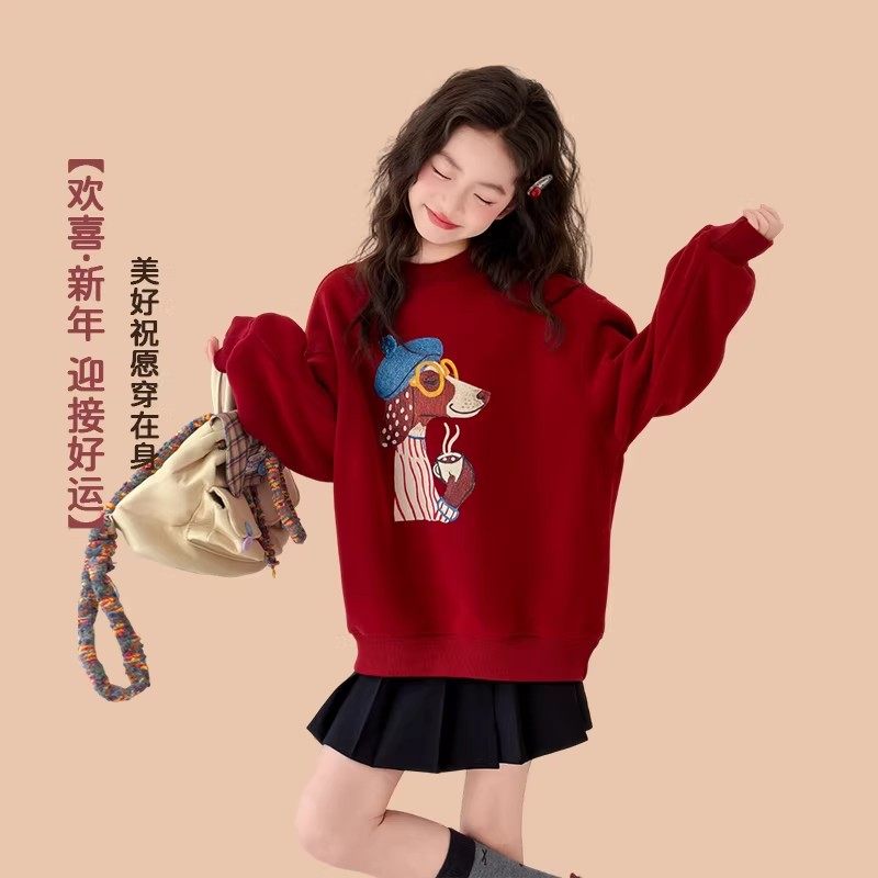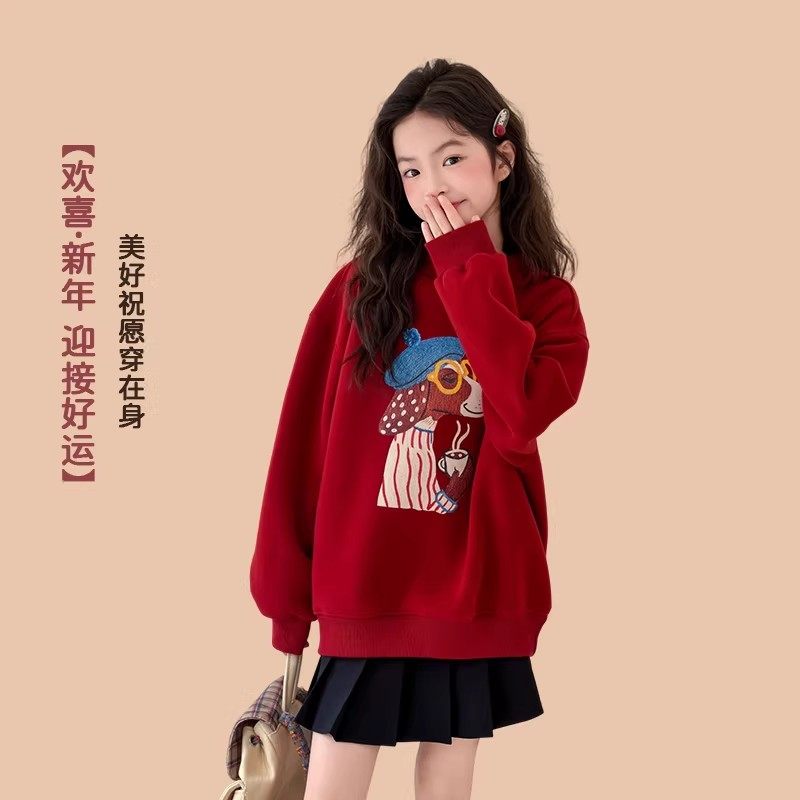 311线报网描述:红色卫衣女大童女孩初中生加绒加厚本命年服