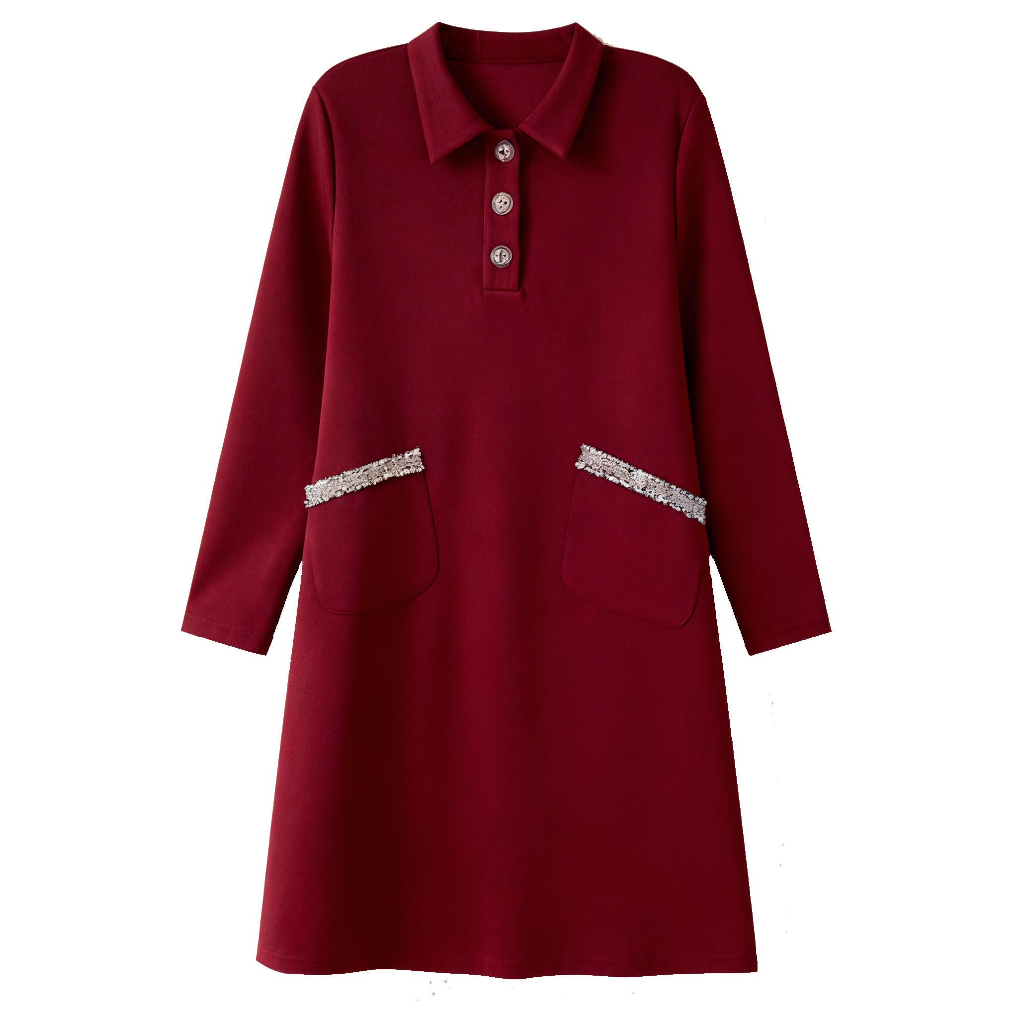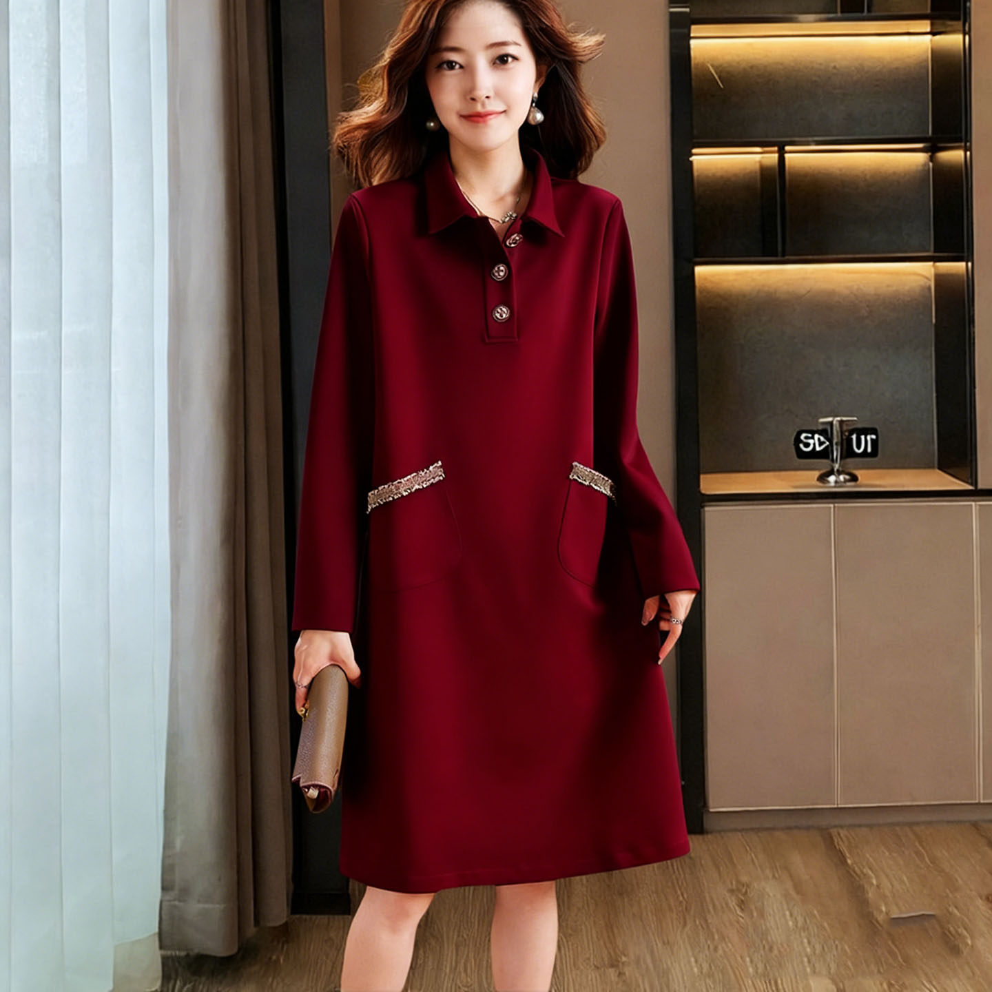 时尚宴会酒红翻领连衣裙女中长款大码显瘦长袖高端太空棉面料女装