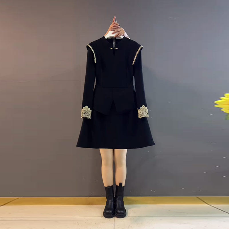 加肥拼色袖口长袖收腰连衣裙胖妹妹气质中长款轻熟风黑色洋气裙子
