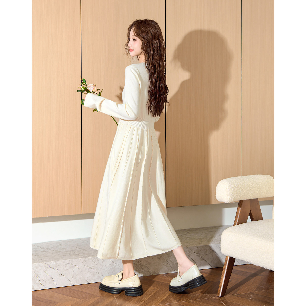 唐狮冬季白色长袖针织连衣裙秋冬款女长款毛衣裙内搭打底裙配大衣
