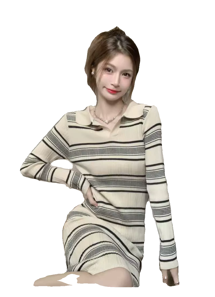 polo领长袖针织连衣裙女秋冬新款修身显瘦包臀裙过膝长款打底裙子