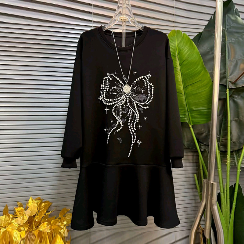 胖MM减龄钉珠蝴蝶结长袖连衣裙加肥大码女装中长款显瘦黑色卫衣裙