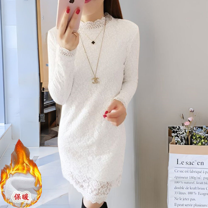 加绒加厚蕾丝打底衫长袖中长款秋冬季小个子配大衣保暖内搭连衣裙