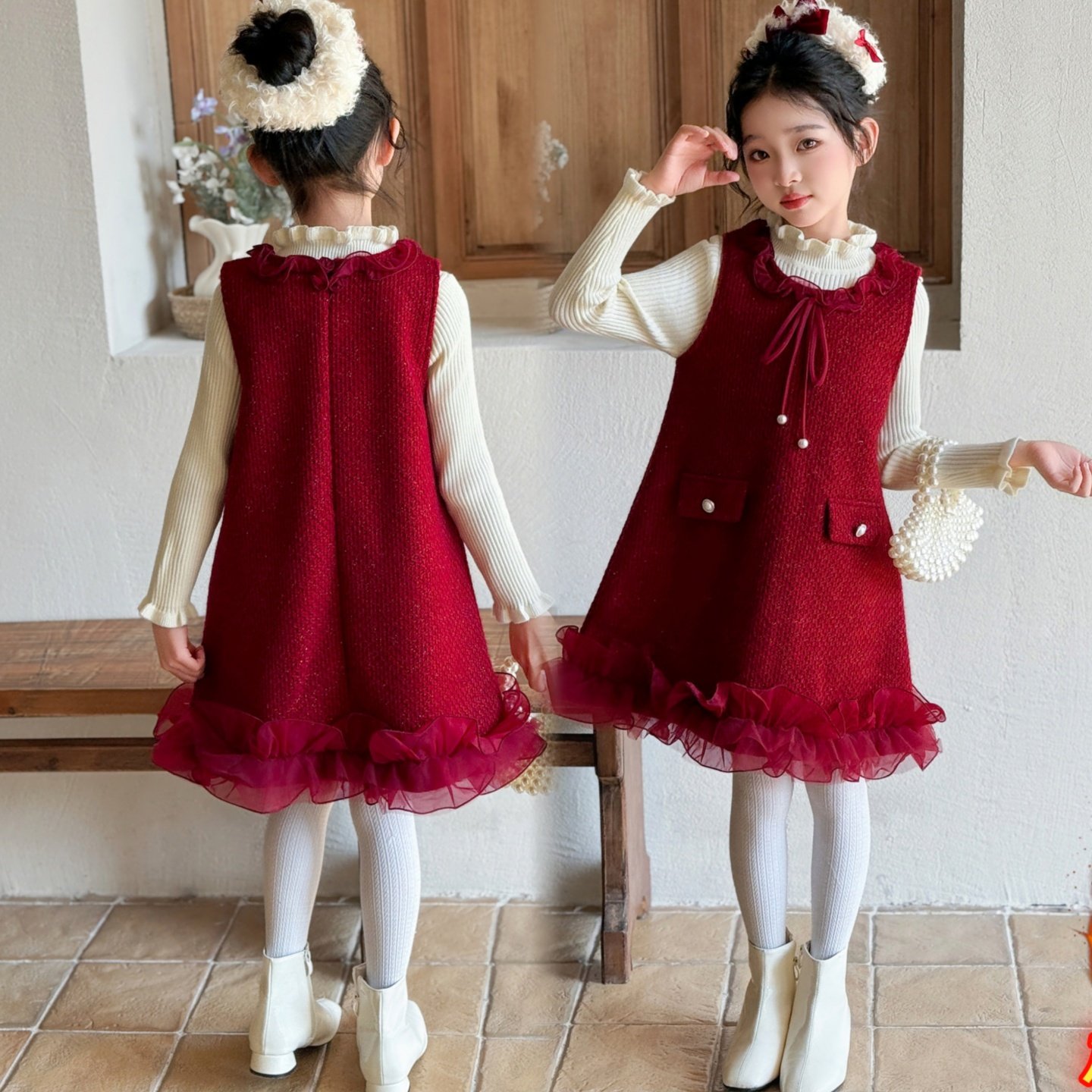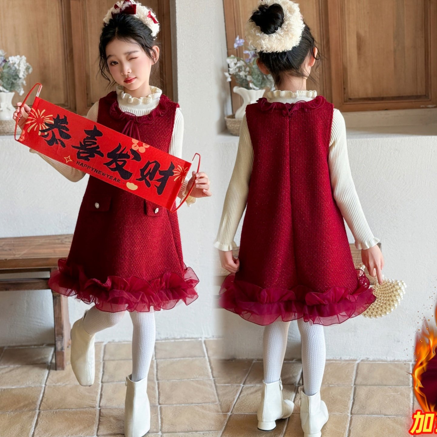 女童连衣裙套装冬装加绒款女孩新年圣诞红色喜庆拜年服千金两件套