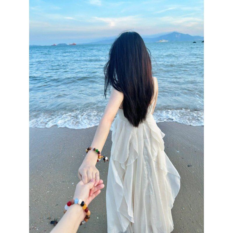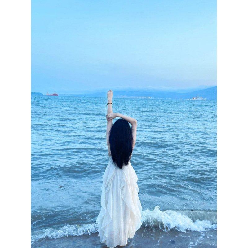 海边度假白色连衣裙子夏季森系收腰仙女吊带沙滩长裙长袖开衫套装