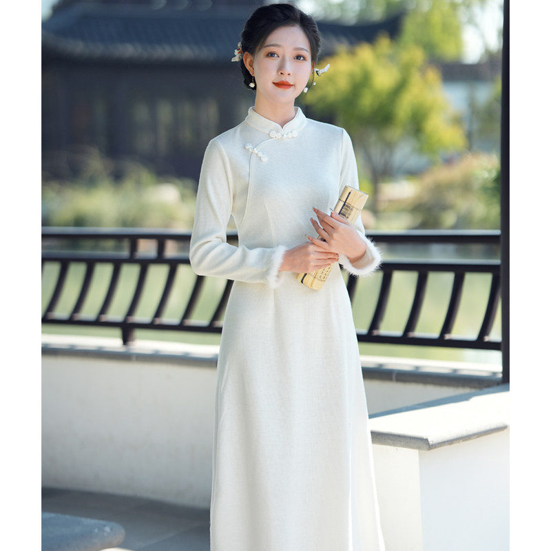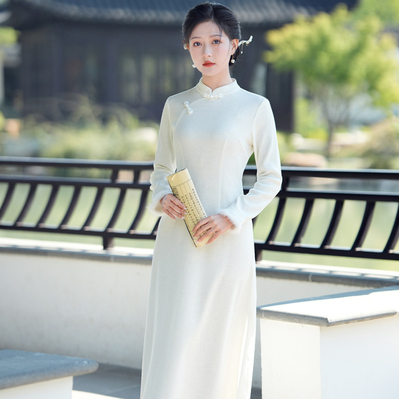 怜雪 秋冬新中式民国风白色连衣裙修身内搭打底针织改良旗袍长裙