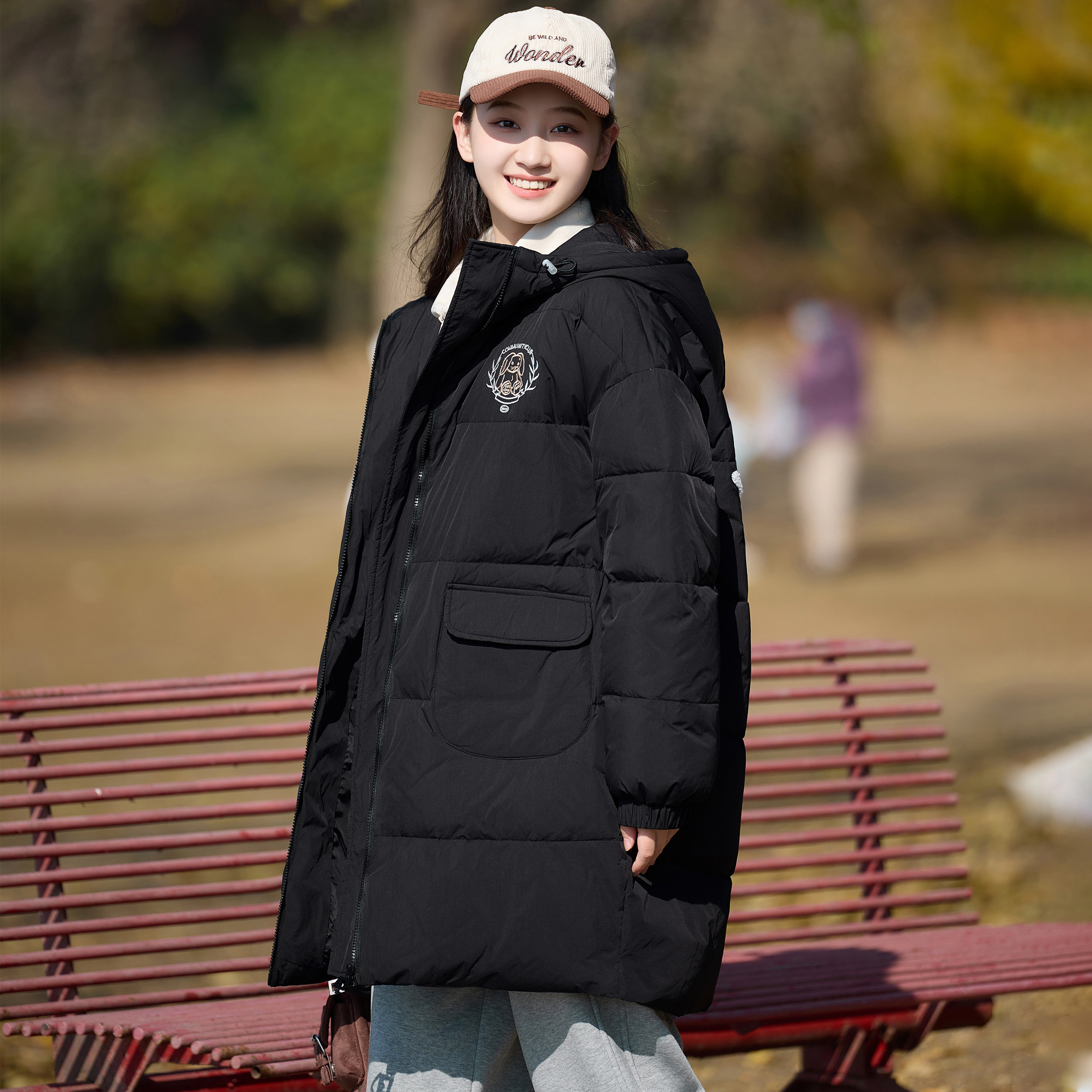 中长款羽绒服少女初中生学院风连帽女黑色加厚工装口袋防寒外套女