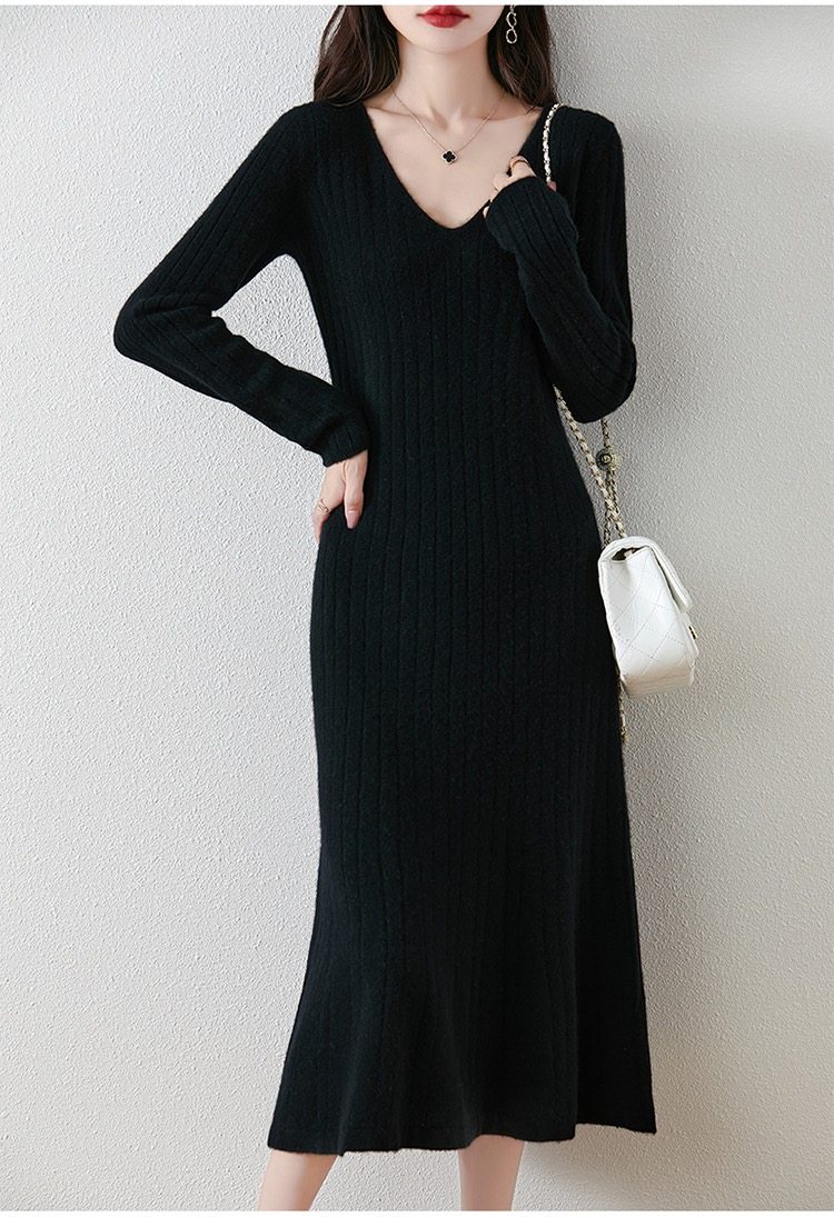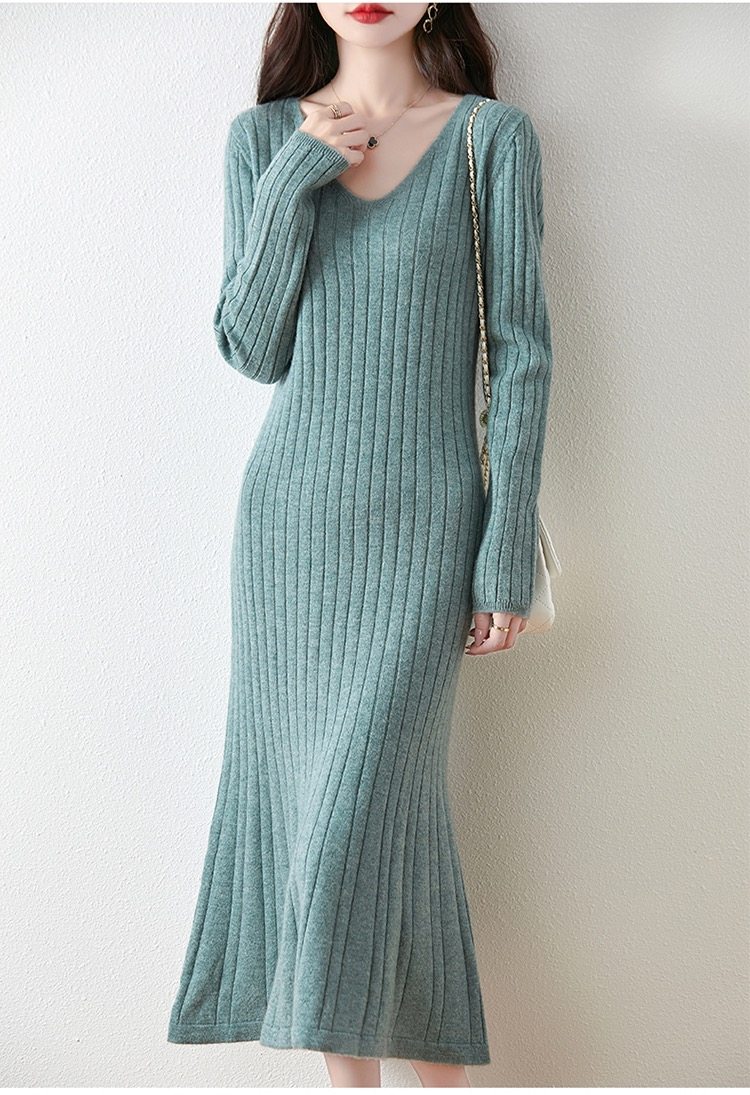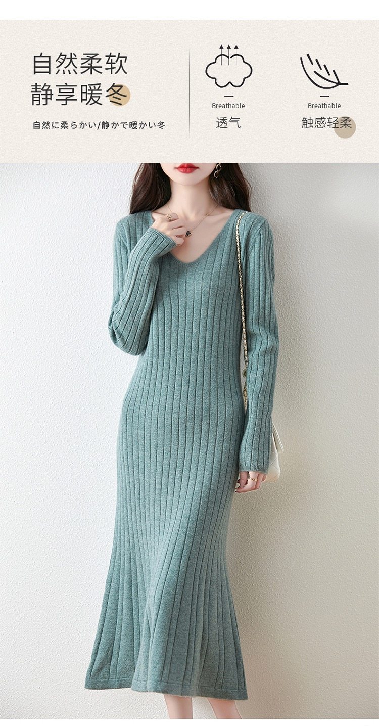 2026冬季新款V领针织连衣裙女中长款抽条修身打底毛衣鱼尾裙子