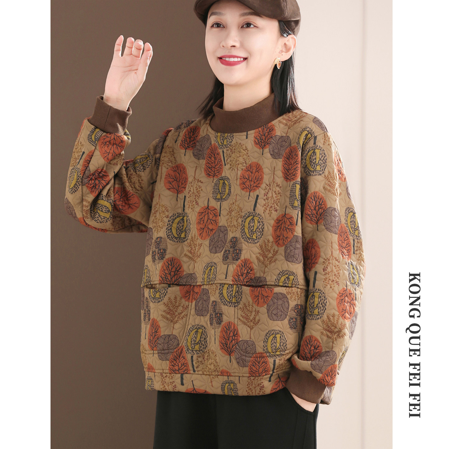 孔雀飞飞冬装韩版大码遮肉印花套头复古女士卫衣女款2025新款加绒