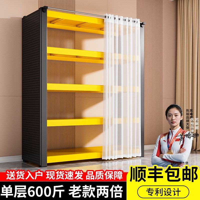 黑黄带防尘帘置物架多层落地收纳架F洞洞板客厅书架储物架阳台货