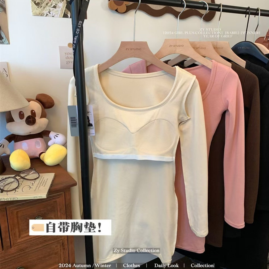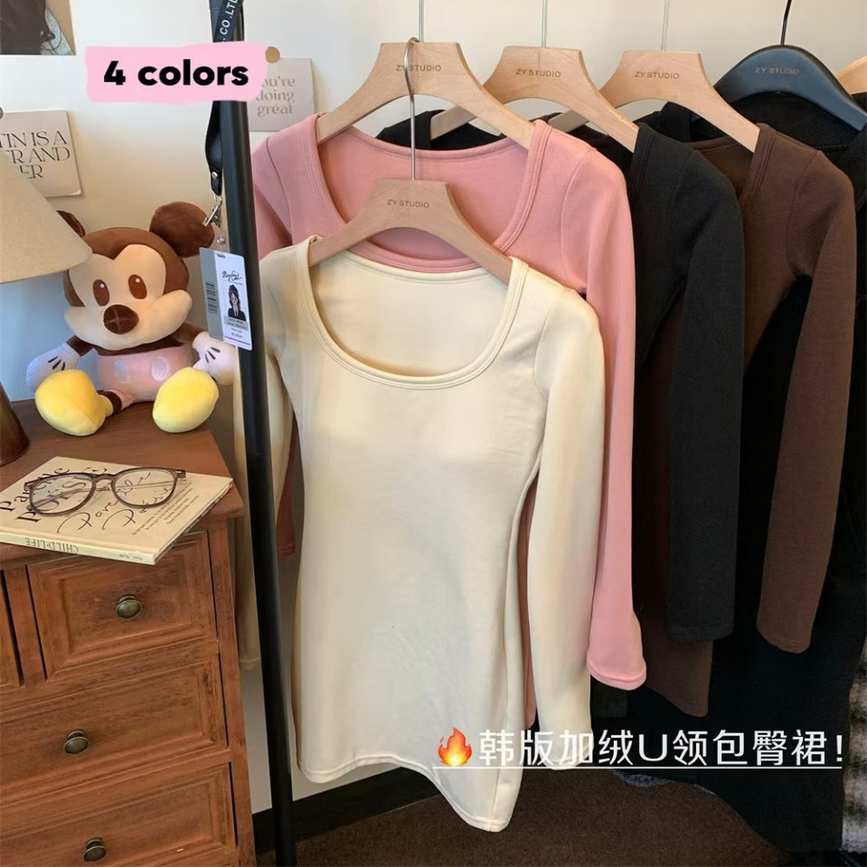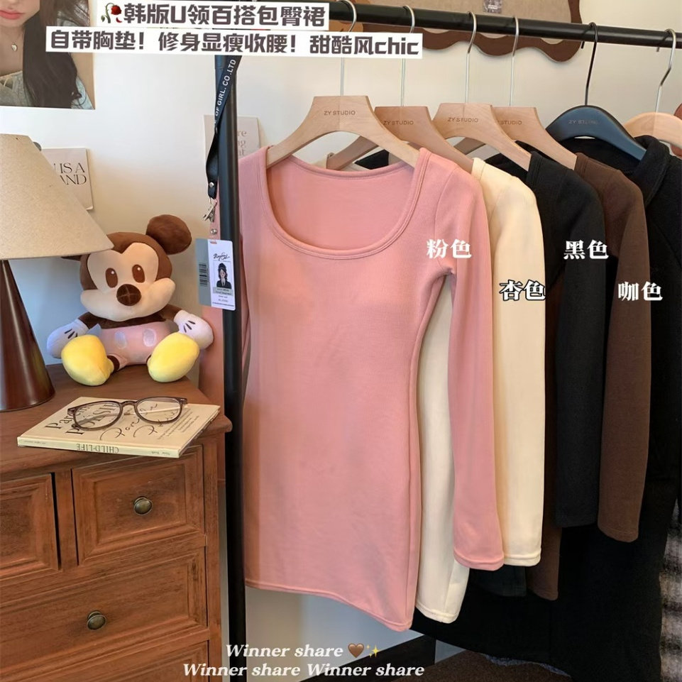 韩系德绒保暖长袖连衣裙女秋冬季内搭带胸垫修身显瘦包臀短裙上衣