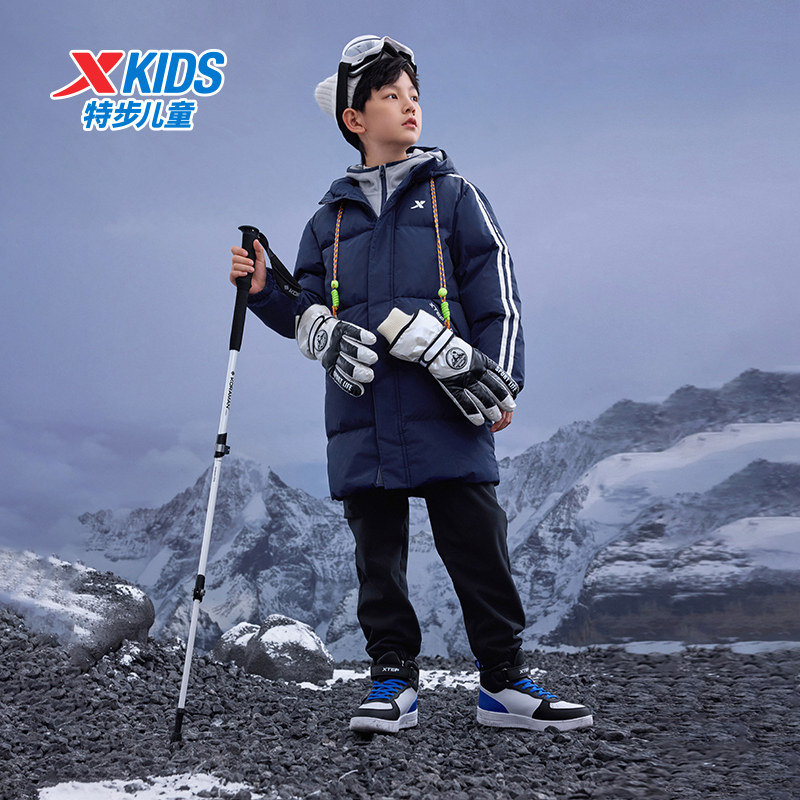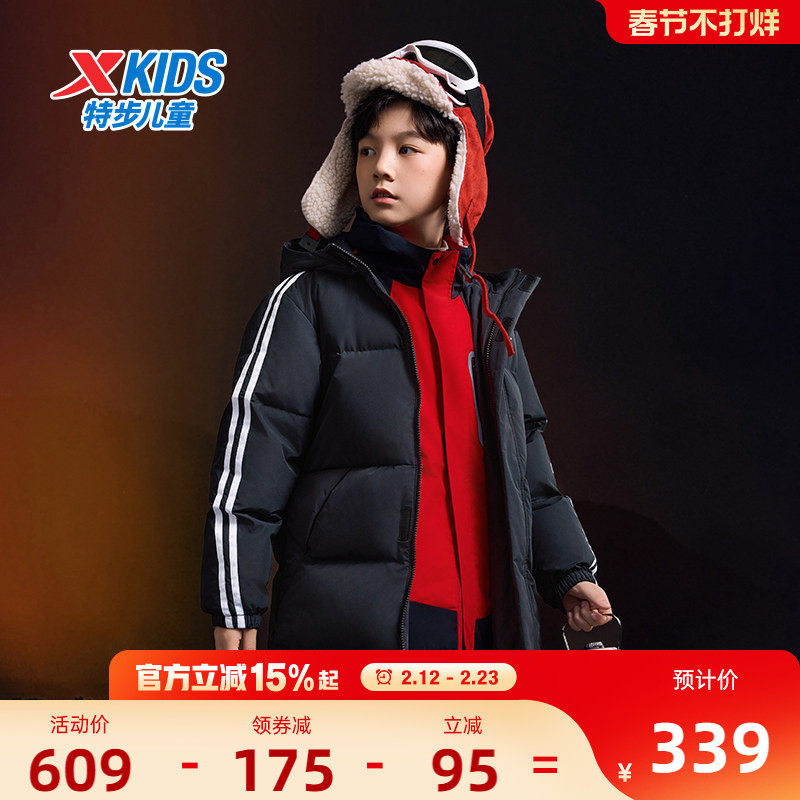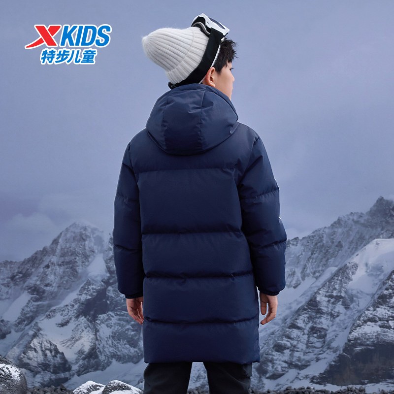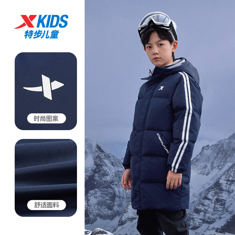 特步童装儿童三防中长款羽绒服男童条纹外套2026年秋冬新款防寒服