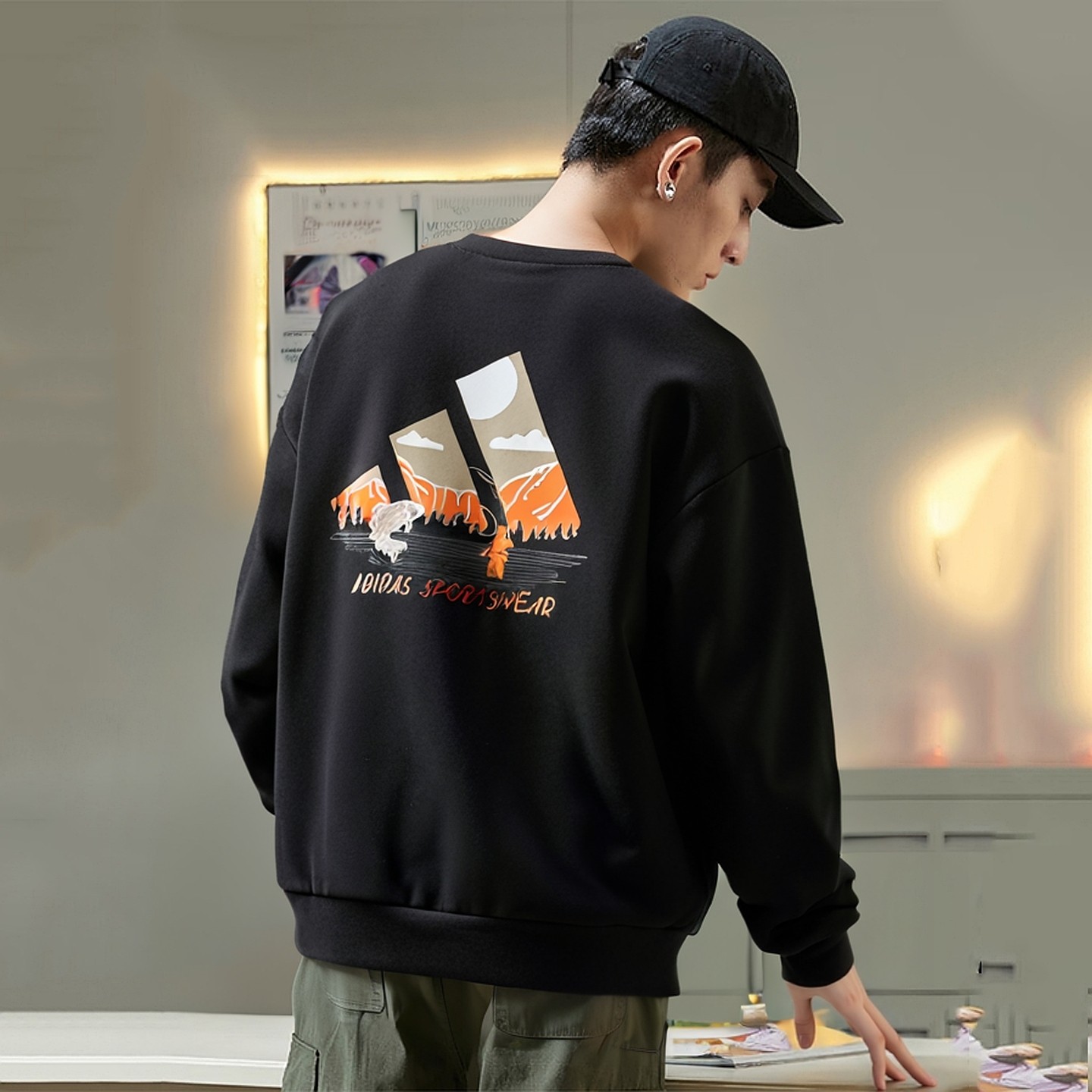阿迪达斯加绒卫衣男秋季新款宽松保暖美式印花黑色篮球套头衫上衣